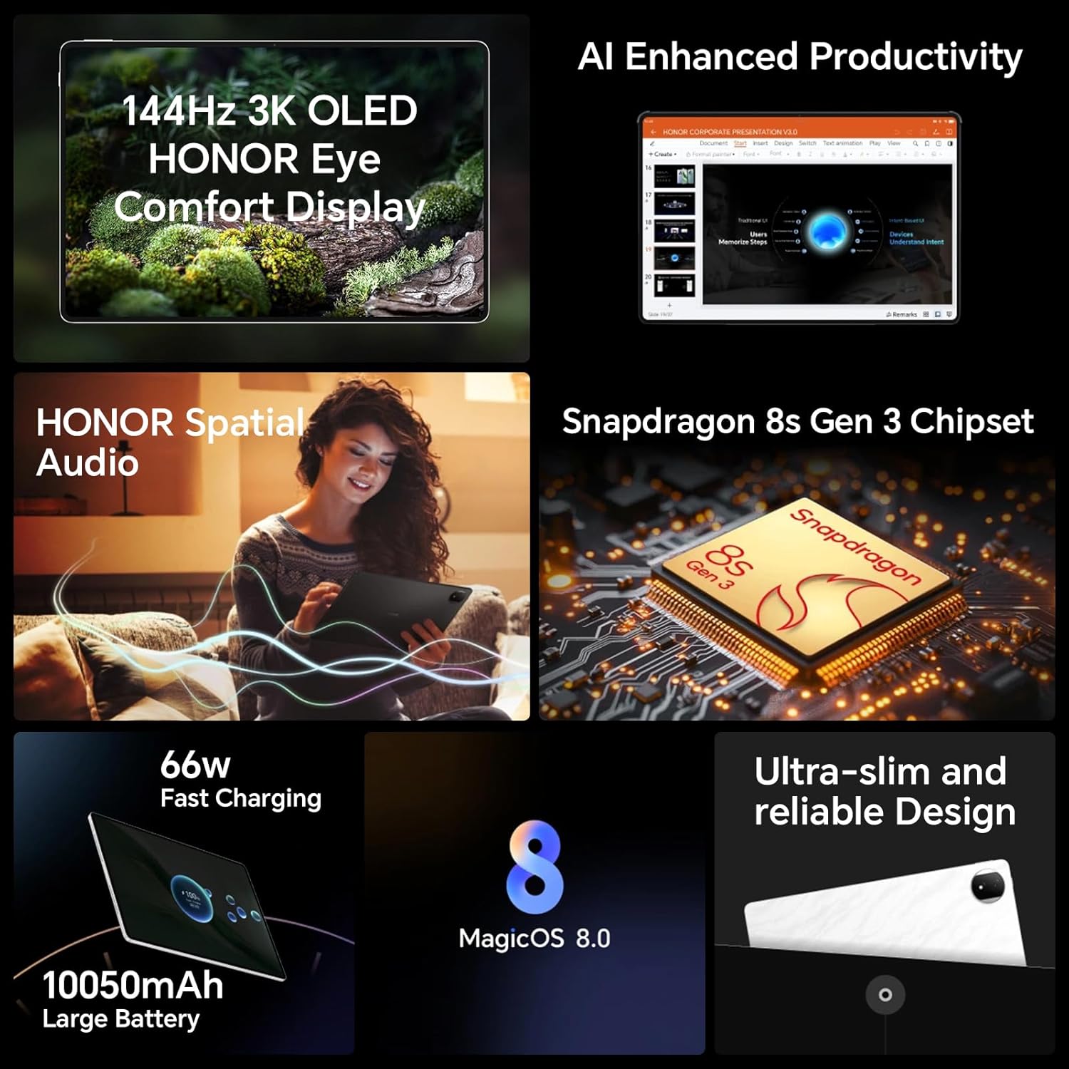 【12.3 inch OLED Display】 HONOR MagicPad2’s 12.3-inch OLED display offers 3K resolution (3000 x 1920 pixels) and 144Hz refresh rate. It features a 92% screen-to-body ratio and a maximum brightness of 1600 nits, making it ideal for watching HD content, browsing the web or playing games in any lighting conditions.