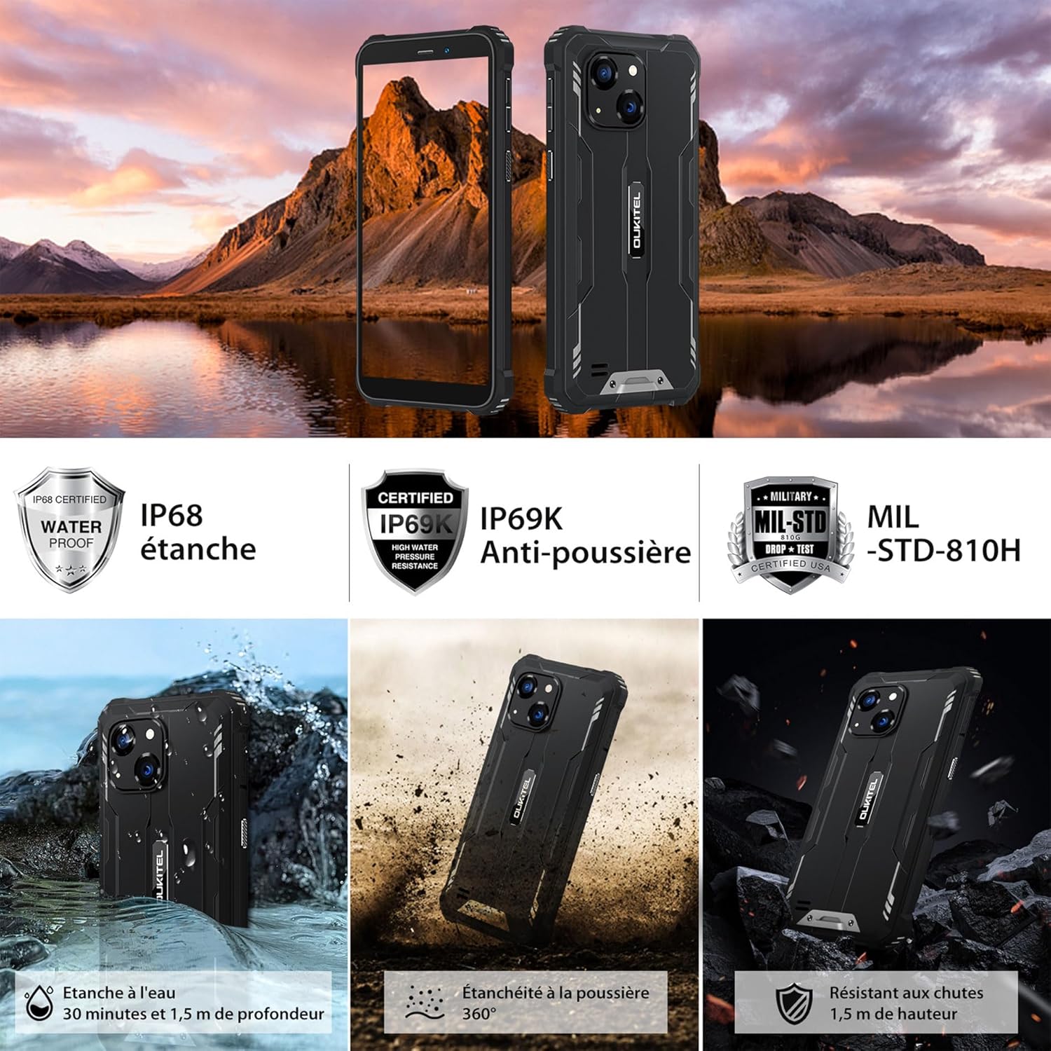 🌄 IP68/IP69K ★ Le téléphone étanche OUKITEL WP32 est un téléphone et abordable certifié IP68/IP69K. Il est étanche jusqu’à une profondeur de 1,5M pendant 30 minutes et résistant aux chocs jusqu’à une hauteur de 1,5M. Il offre une protection complète contre la poussière et les chutes. Avec une plage de température de -40°C à 70°C, il convient à différents environnements extérieurs. Idéal pour les agents de nettoyage, les travailleurs agricoles, les mineurs et les ouvriers du bâtiment.