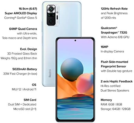 Fiche Technique Redmi Xiaomi Note 10 Pro 4G Volte 128 Go + 6 Go débloqué en usine 6,67″ 64 MP Quad Camera Mode nuit (pas Verizon Sprint Boost Cricket) (avec chargeur de voiture rapide) (bleu glacier)