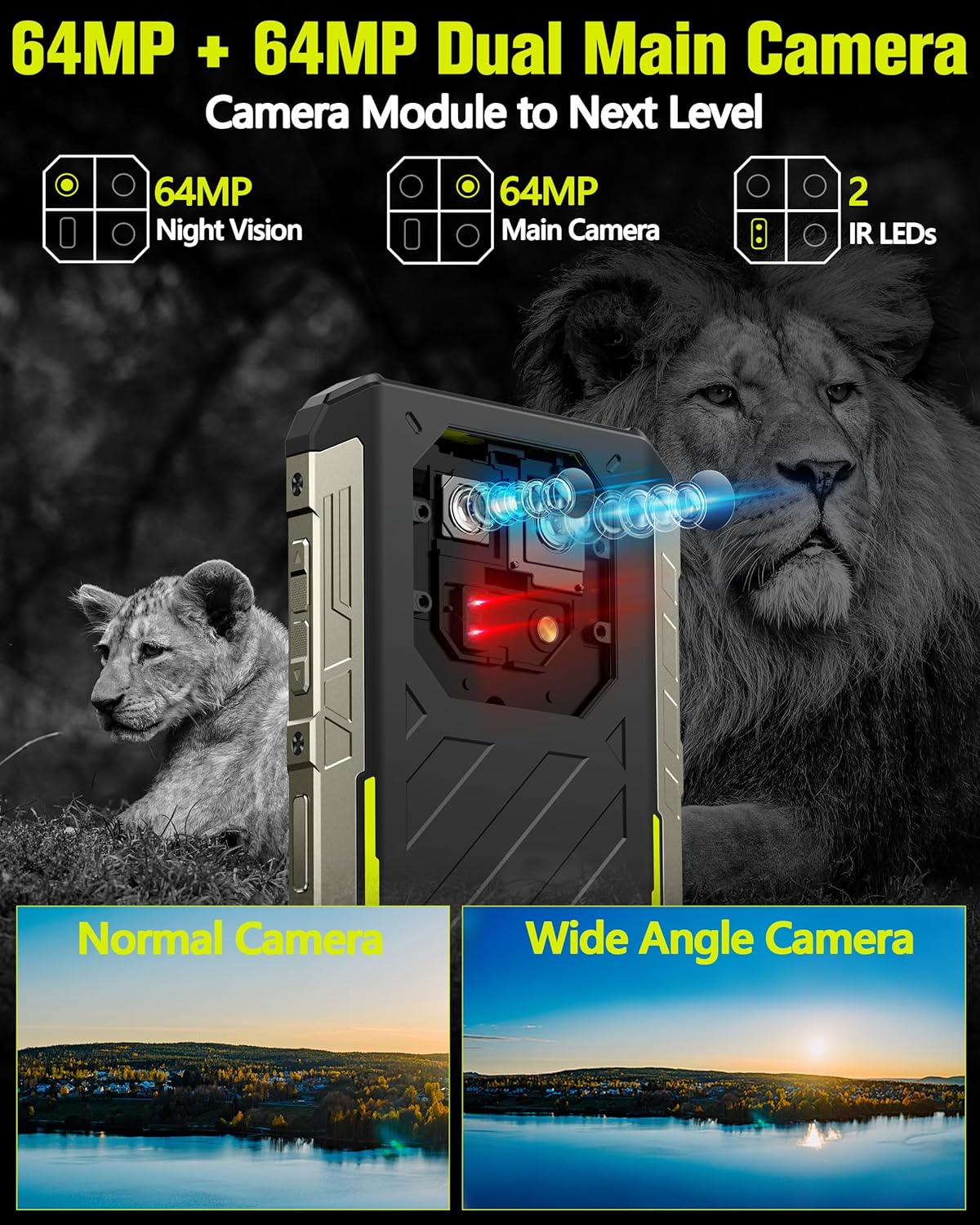 64MP Wide-Angle Camera: Ulefone Armor 22 Unbreakable Cell Phone, 64MP Sony IMX686 Wide Camera with ƒ/1.89 Aperture, Sensor Size 1/1.7″, Pixel Size 0.8µm, More Light, Fine Details. With advanced Ulefone NightElf Ultra 2.0 algorithm and less interference. Dual camera, 64MP wide-angle camera and 64MP night vision camera. Taken to new heights. And combined with IR LEDs and flash modules, the overall module is highly technological.
