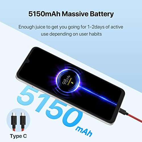 Grand écran plein écran de 6,7″, né pour la vidéo et les jeux. Ce téléphone portable 4G débloqué est doté d’un grand écran haute définition avec des couleurs vives et de larges angles de vision. Il vous offre une expérience visuelle immersive semblable au cinéma, peu importe quand vous regardez des films ou jouez. Jeux.Avec une batterie massive de 5 150 mAh et une charge rapide de 10 W par câble de type C, le téléphone Android débloqué GSM vous permet de profiter de moments merveilleux sans anxiété liée à la batterie.
