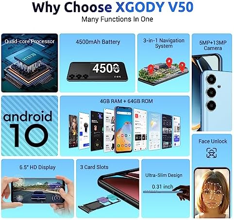 【Autonomie longue durée pour un plaisir toute la journée】Avec une batterie de 4 500 mAh, profitez d’une autonomie prolongée qui dure toute la journée, éliminant le besoin de recharges fréquentes. Le poids modéré, la prise en main confortable et la coque arrière mate élégante des smartphones déverrouillés s’intègrent parfaitement dans votre vie. Contrairement aux téléphones Android plus lourds dotés de batteries plus grosses, le téléphone portable déverrouillé Xgody V50 établit un équilibre entre confort et fonctionnalité.