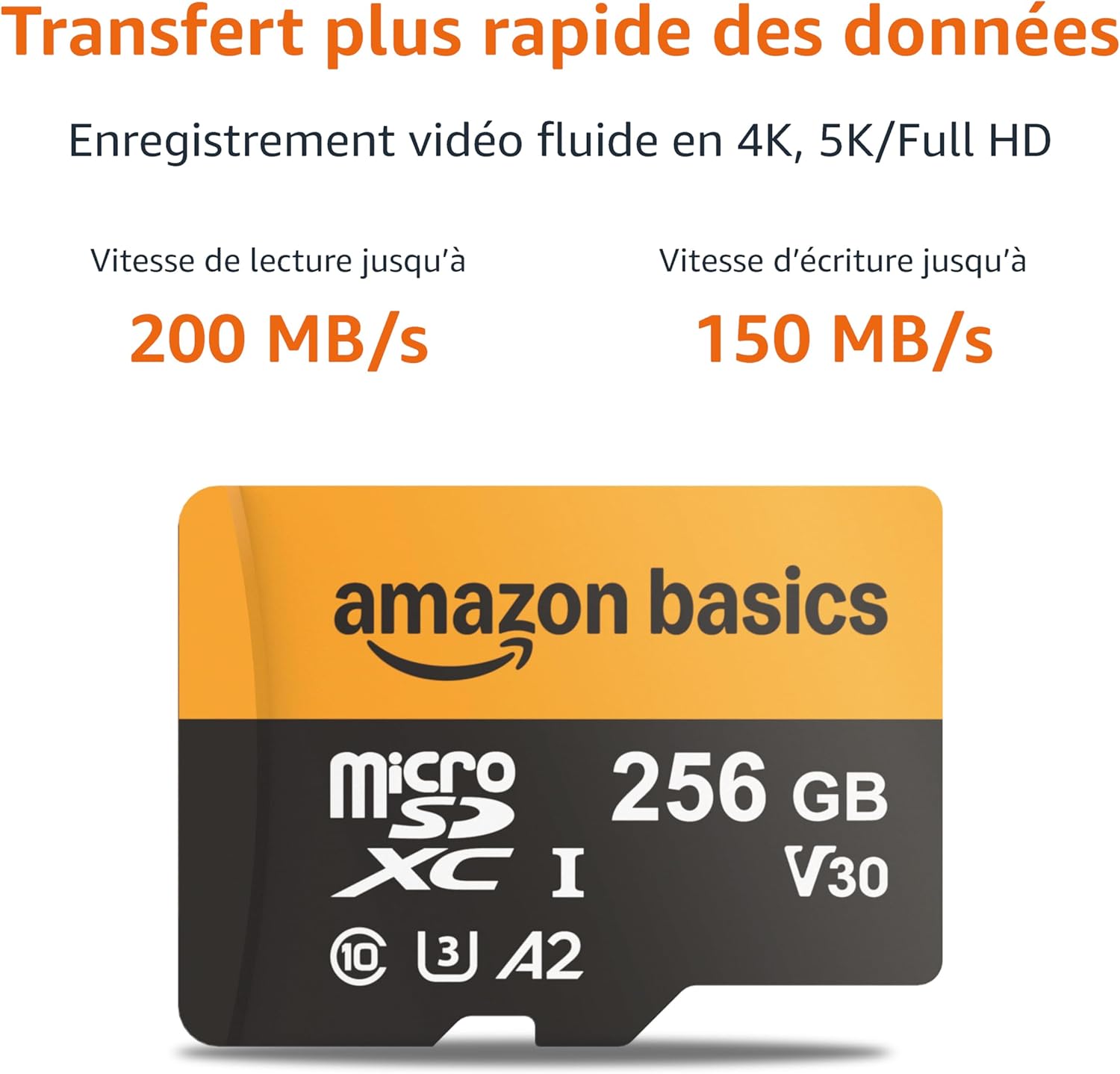 Fiche Technique Amazon Basics 256GB microSDXC Card with Adapter, Read Speed up to 200MB/s, Pack of 1 au Maroc