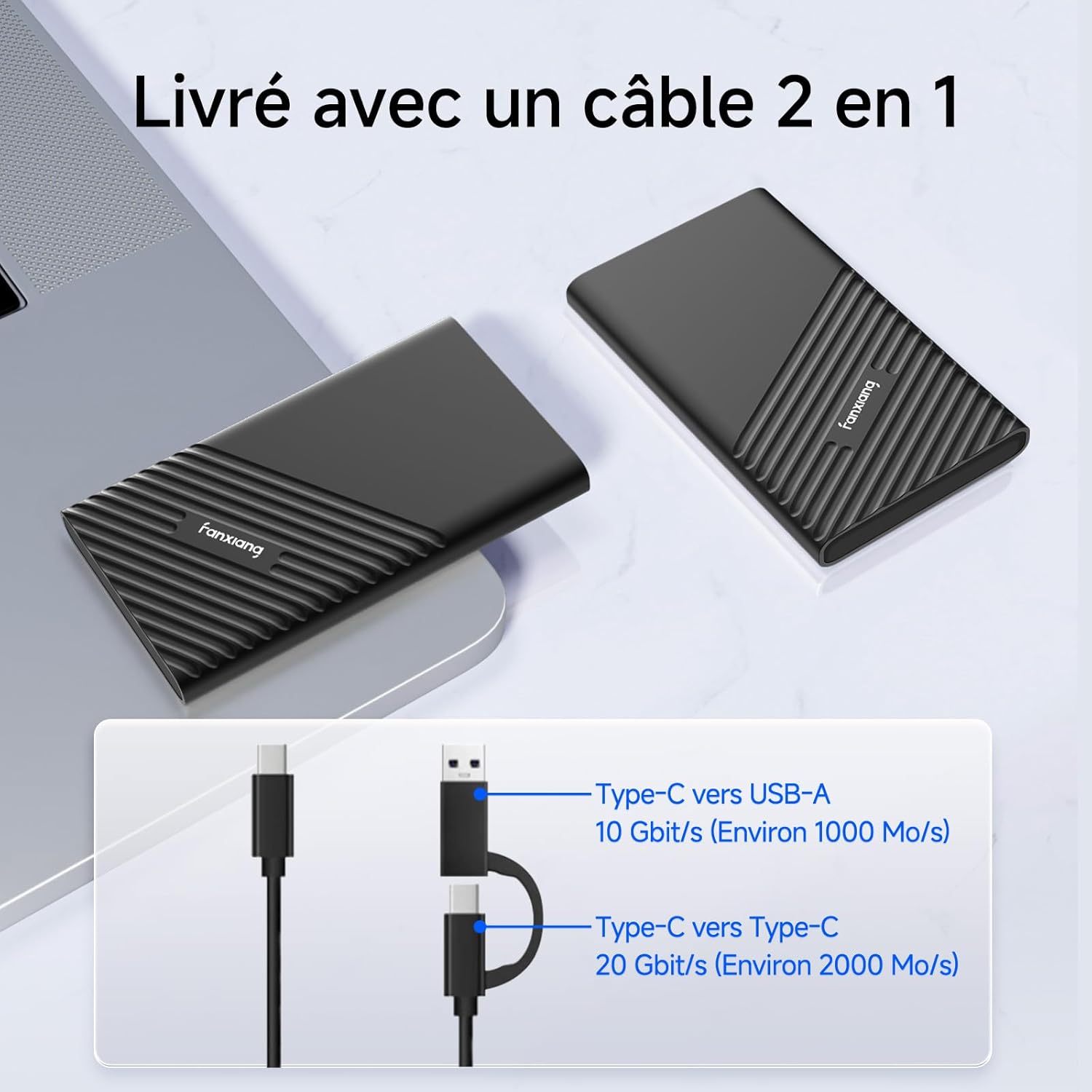 Fiche Technique fanxiang 1TB Portable External SSD, Up to 2000MB/s Reading, USB 3.2 Gen2 USB C PSSD, Portable SSD Drive for PC/Laptops/Mac/OTG Phone/iPhone 15/PS4/XBOX au Maroc