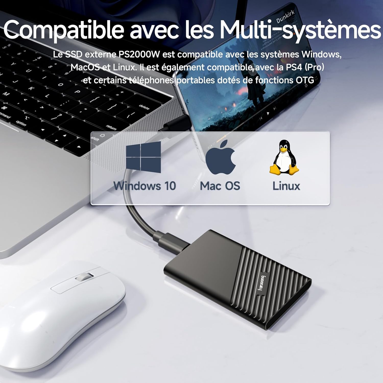 Portable external hard drives are compatible not only with traditional laptops and desktops, but also smart TVs, PS5/PS4(Pro) gaming consoles, Xbox series, Mac, Win 7 and later, and some OTG enabled Android phones