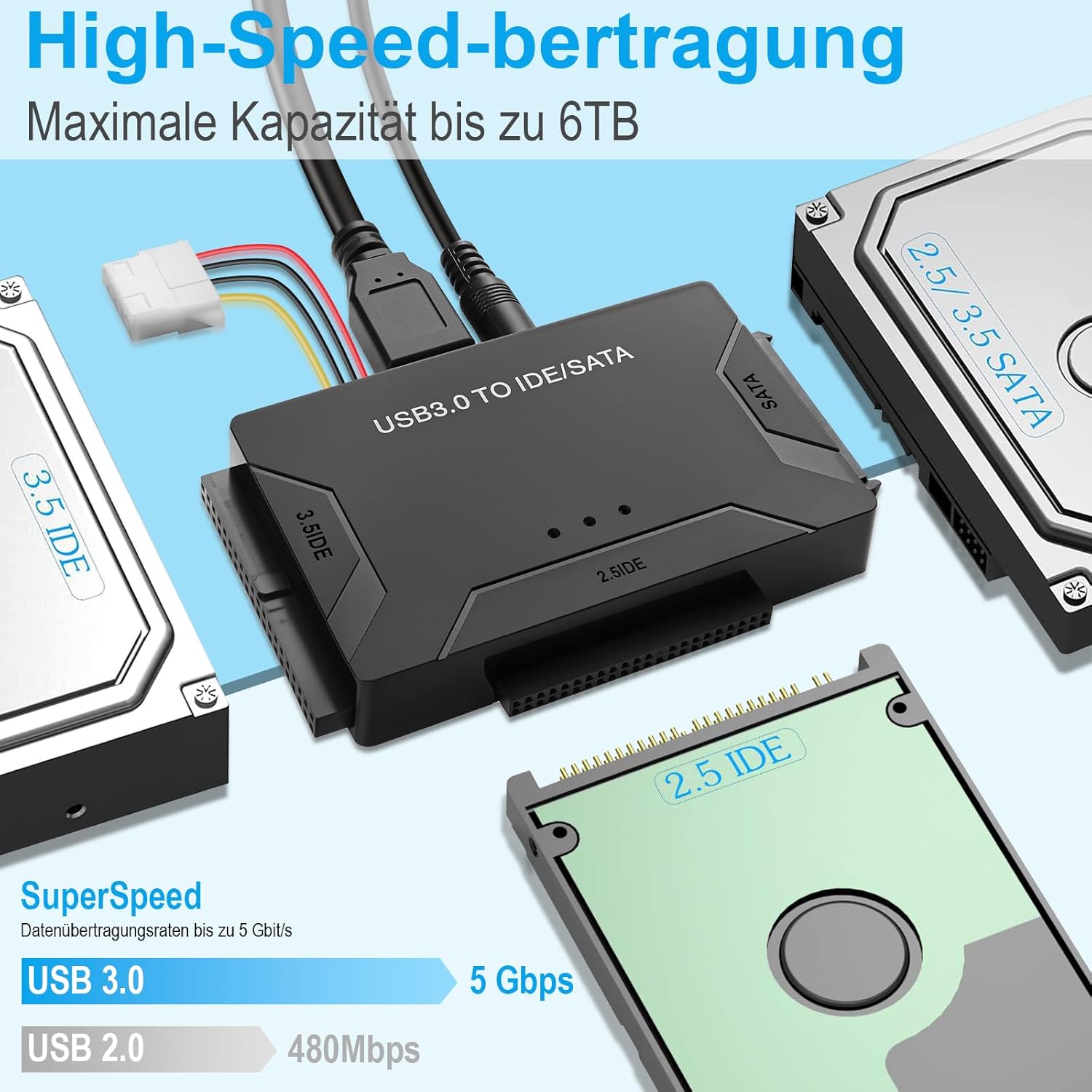 SATA to USB 3.2 Adapter Cable for 2.5″ 3.5″ SATA HDD and IDE Hard Drive, Supports 6TB, with 12V 2A Power Supply, USB Cable and SATA Cable