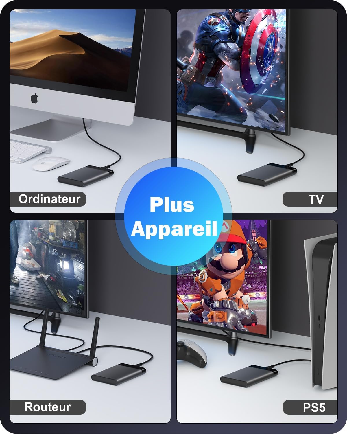Universal compatibility: This sata 2.5 case is designed for a 2.5 inch 7mm/9.5mm SATA hard drive and an SSD up to 4TB. Compatible with Windows, Linux and Mac OS and above and compatible with Western Digital, Toshiba, Samsung, Kingston, Crucial, Hitachi etc. Widely used in PC, laptop, Xbox, PS5/PS4/PS3, routers etc. (Backward compatible with USB 2.0 or 1.1)