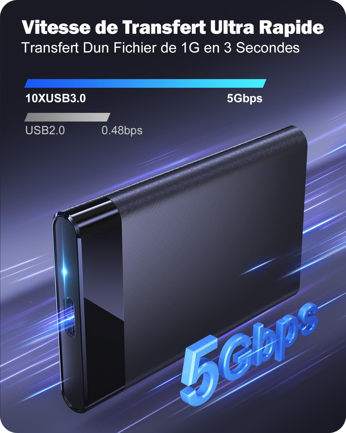 Super Speed 5Gbps & UASP: HDD 2.5 case adopt High speed USB 3.0 transfer supports a transfer rate of 5Gbps and dual acceleration protocol UASP+TRIM, 900% faster than traditional USB 2.0, transferring HD movies, music and data in 3-4 seconds.