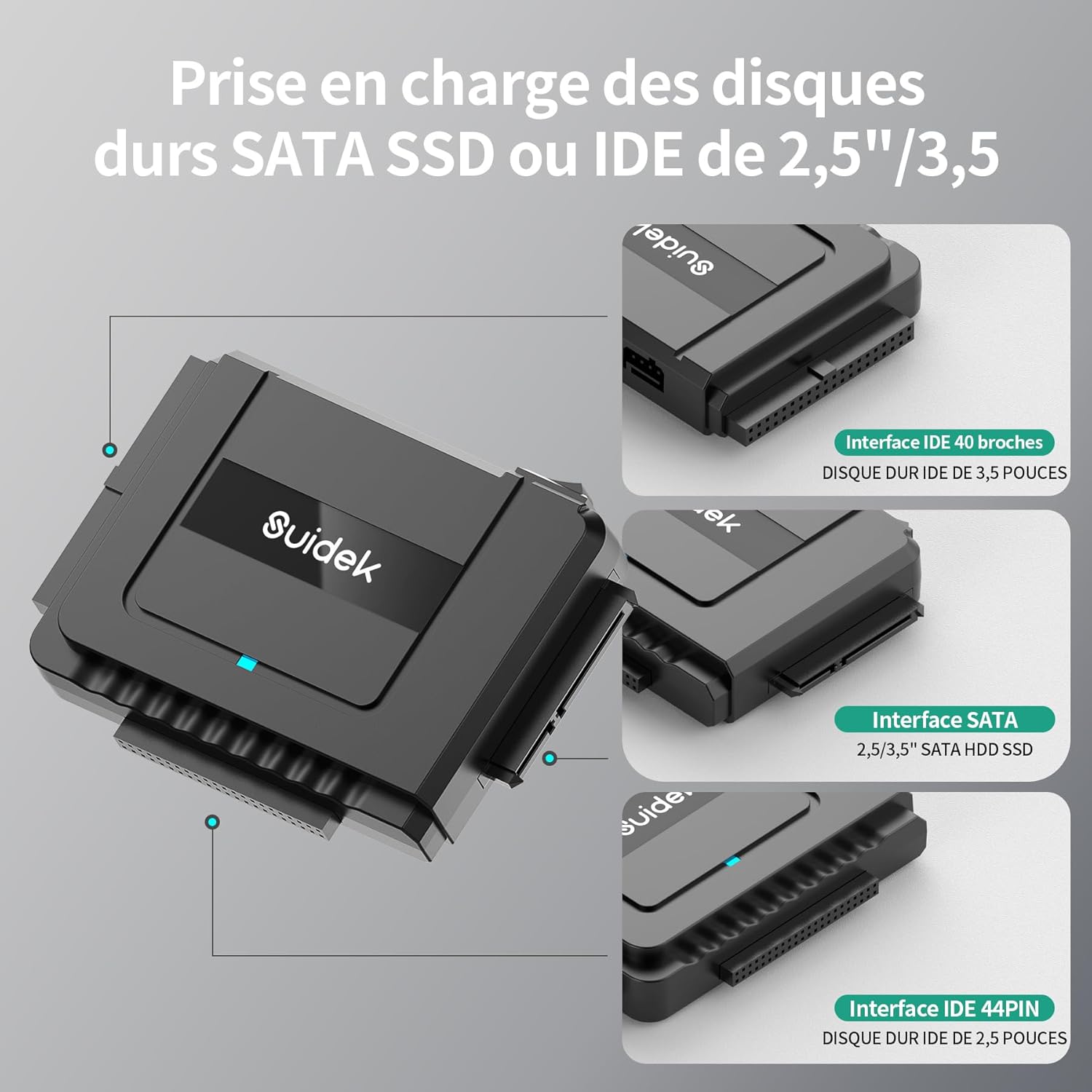 Avis sur SUIDEK Convertisseur USB 3.0 vers IDE SATA – Lecteur de disque dur externe SATA vers IDE pour disque dur HDD/SSD 2,5″/3,5″, Adaptateur IDE SATA vers USB C compatible avec Lecteur Optique SATA/IDE