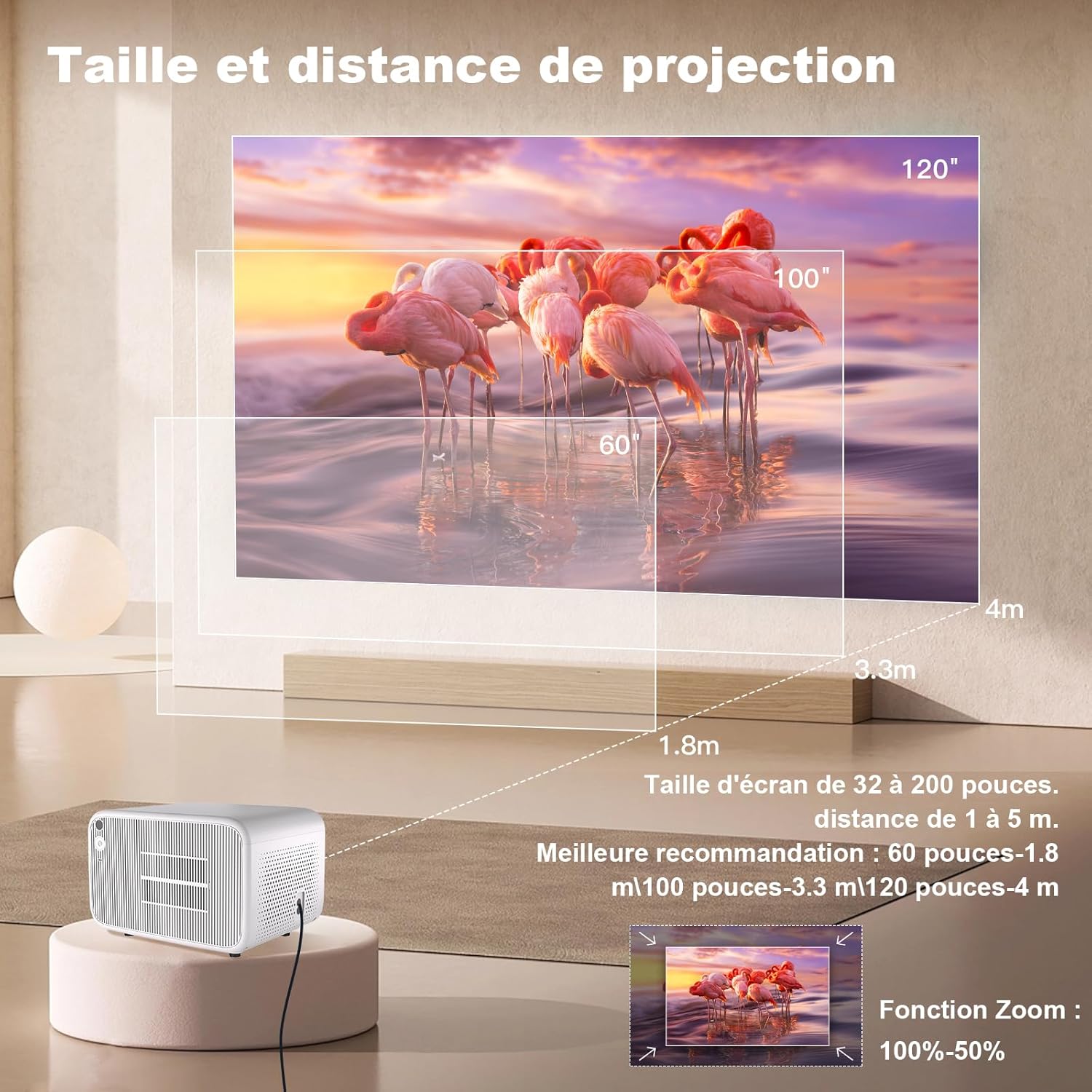 【Supporté 4K Natif 1080P + Zoom 50%】Le vidéoprojecteur wifi Bluetooth a une luminosité élevée de 20000 lumens, une image native 1080p Full HD, un rapport de contraste de 15000: 1. La gamme de couleurs NTSC atteint 95%, restaurant la clarté et les vraies couleurs dans la plus grande mesure. Vous pouvez profitez d’une expérience de visionnement large de 32 à 200 pouces dans une distance de 1-5m. La fonction zoom 100%-50%, l’image peut être ajustée à la taille appropriée sans bouger.