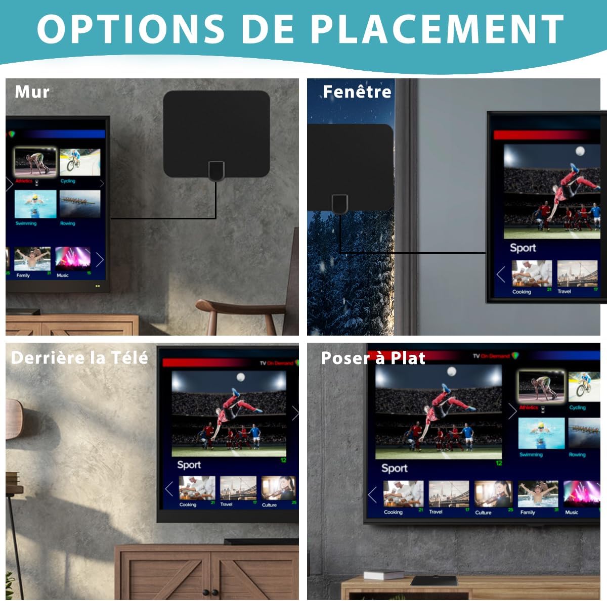 【Léger Souple Ultra-Mince】L’antenne est mince souple comme une feuille de papier pour une installation facile. Placez l’antenne sur la fenêtre pour une réception optimale, branchez l’antenne au port «ANT / IN» sur le dos du téléviseur ou décodeur TNT, connectez le câble USB à n’importe quel port USB pour alimenter l’amplificateur, scannez les chaînes en sélectionnant “Menu” puis “Recherche de chaînes” et profitez des chaînes HD.