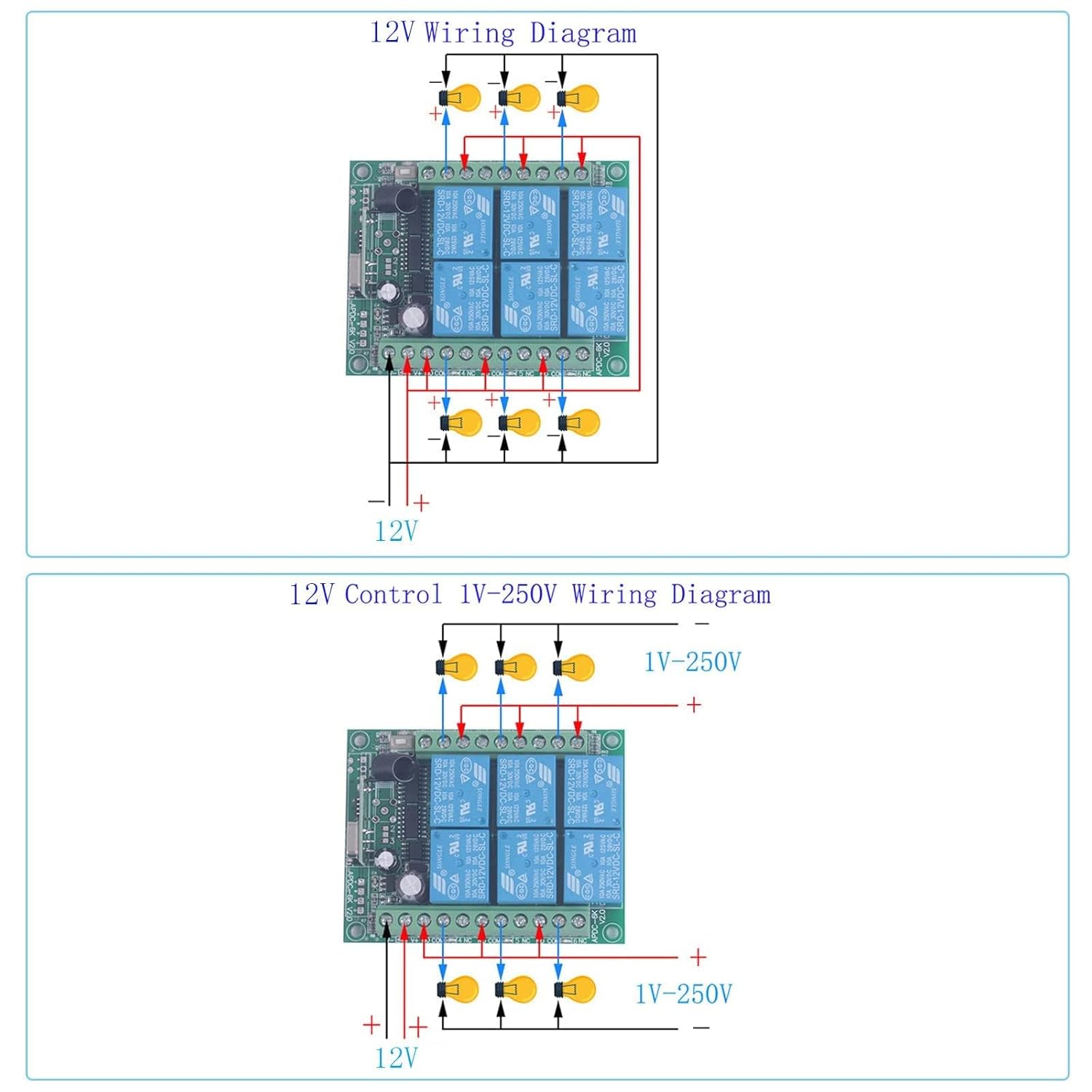 【Control voltage】 DC 12V, high voltage low voltage control switch【Relay charge】 10A 1V-250V (DC/AC), / 10A 250V AC, 10A 125V AC, 10A 30V DC, 10A 28V DC, 10A 12V, wide voltage load.