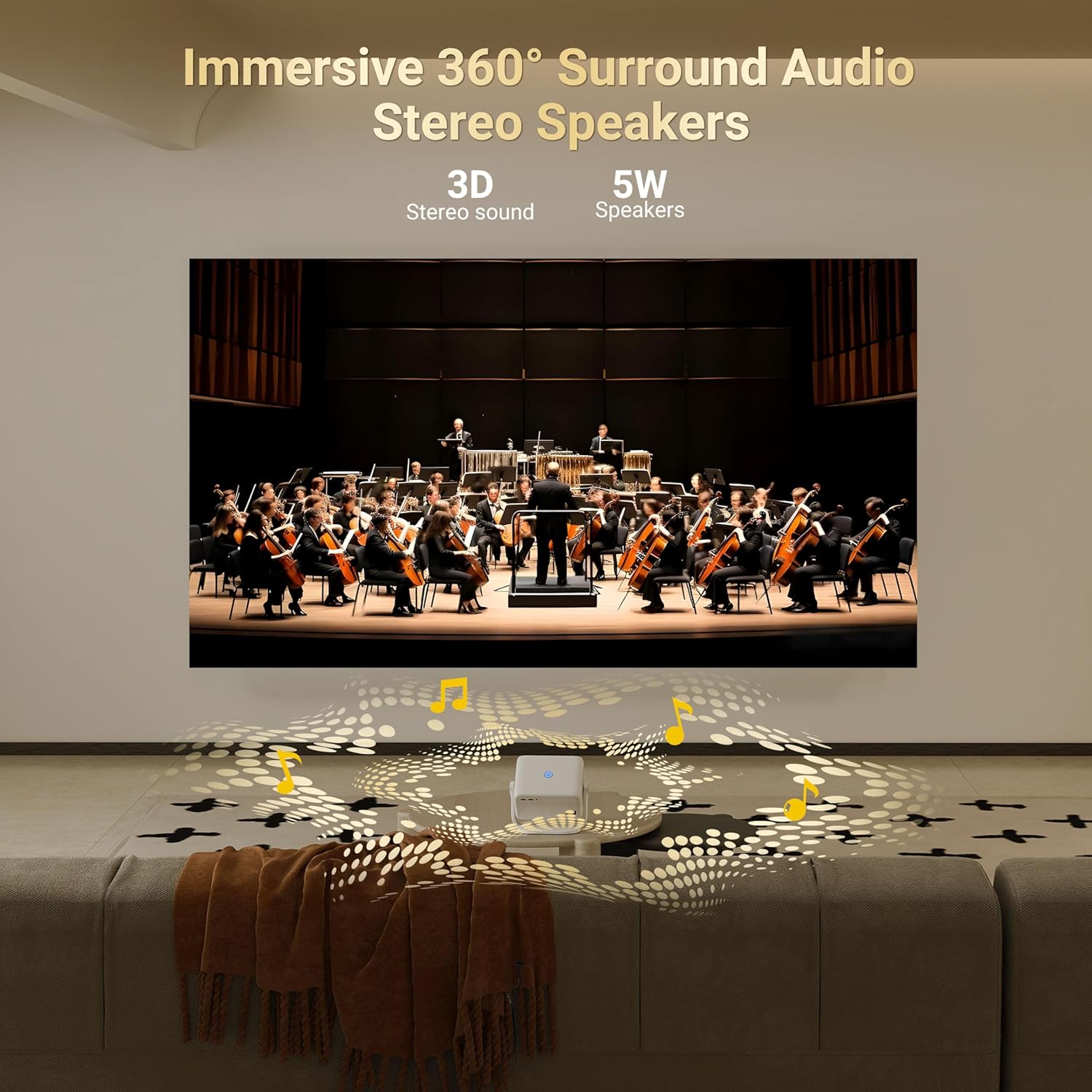【Noise Reduction Technology and HiFi Stereo Sound】Equipped with HiFi stereo speakers and 80% noise reduction, this mini bluetooth projector ensures an immersive and silent audio experience