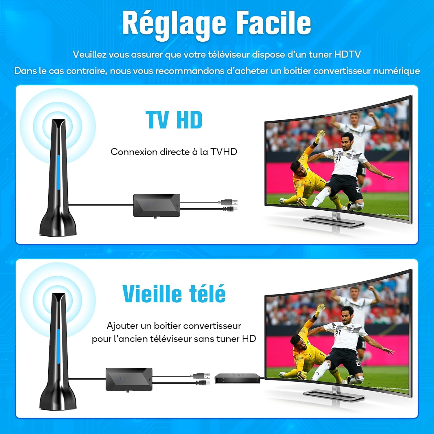 La nouvelle version antenne DGUPSP antenne hd numérique équipée des dernières technologies, Contrôleur de signal d’amplificateur 2024 puissant et amélioré avec technologie intégrée de puce Smart IC de nouvelle génération et de filtre transparent;est conçu pour regarder la télévision gratuite, TNT HD facilement, rapidement et avec une très bonne qualité de réception. L’amplificateur de signal avec un gain de 25 dBi rend la portée de réception du signal jusqu’à 120 kilomètres et permet de obtenir une image plus claire et stable avec un faible bruit.