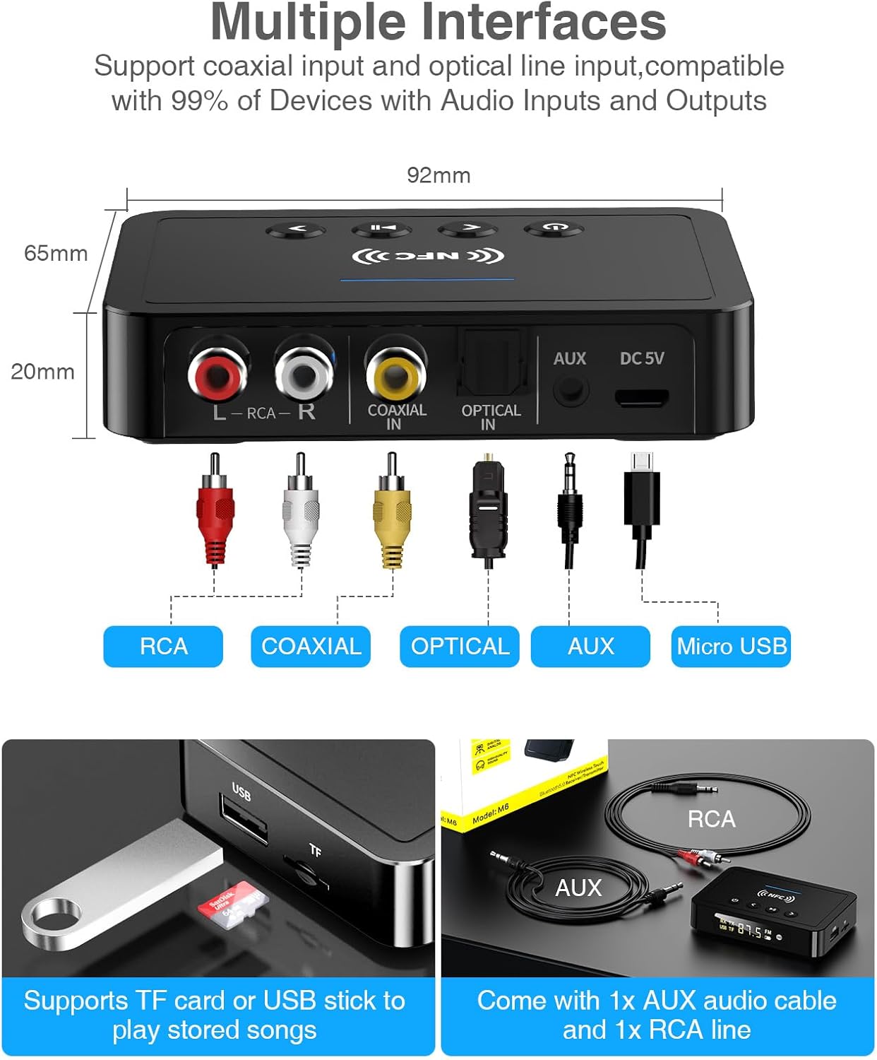 ✨【Type d’interface et service intime】✨ L’émetteur Bluetooth dispose d’interfaces AUX, RCA, fibre optique de 3,5 mm, d’interfaces d’entrée coaxiales et d’interfaces de sortie AUX, RCA, et prend en charge l’utilisation de cartes mémoire TF et de disques U pour lire des chansons enregistrées. Le paquet contient un adaptateur Bluetooth*1, un câble audio AUX*1, un câble RCA*1, un câble de chargement*1 et un manuel d’utilisation*1. Nous offrons une garantie d’un an. Si vous avez des questions, veuillez nous contacter via le message Amazon.