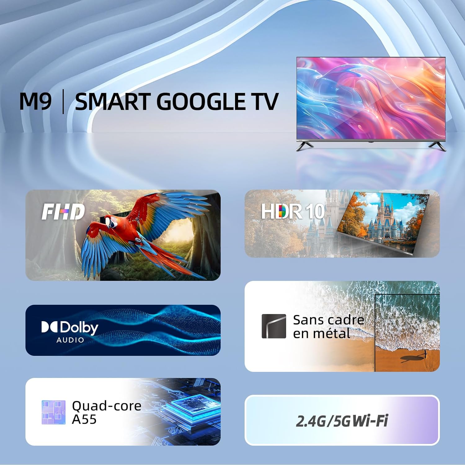 Fiche Technique CHiQ L40M9E 40-inch Smart TV, HDR10, Google TV, Triple Tuner, Dolby Audio, DBX-TV, HDMI, USB, No Metal Frame, Black au Maroc