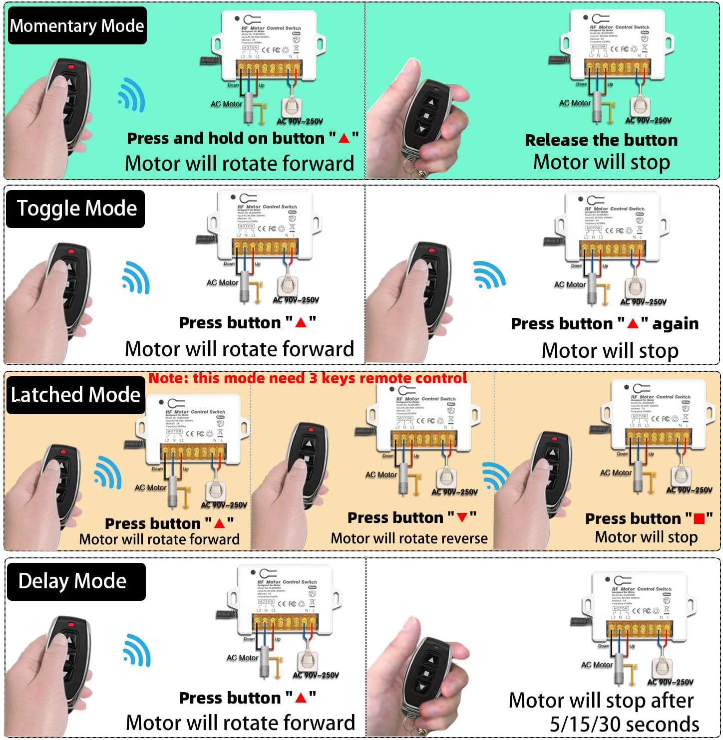 Extrêmement facile à configurer et à réinitialiser. Il existe 3 modes de fonctionnement (momentané/bascule/mode verrouillé/mode retard). Vous pouvez facilement vous configurer en fonction de vos besoins. Le mode de fonctionnement est réglable. Vous pouvez contrôler la rotation du Volet roulant en avant et en arrière. ce qui rend ce système de contrôle plus efficace pour le contrôle du Volet roulant. Grande borne de fil, facile à câbler.