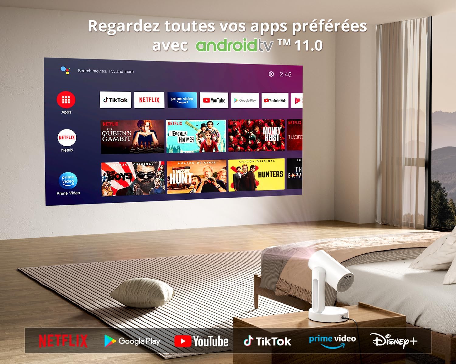 1) Le projecteur est équipé du système AndroidTV 11.0 et l’application vidéo est déjà intégrée en usine. Vous pouvez également télécharger d’autres applications vidéo sur le système Android.