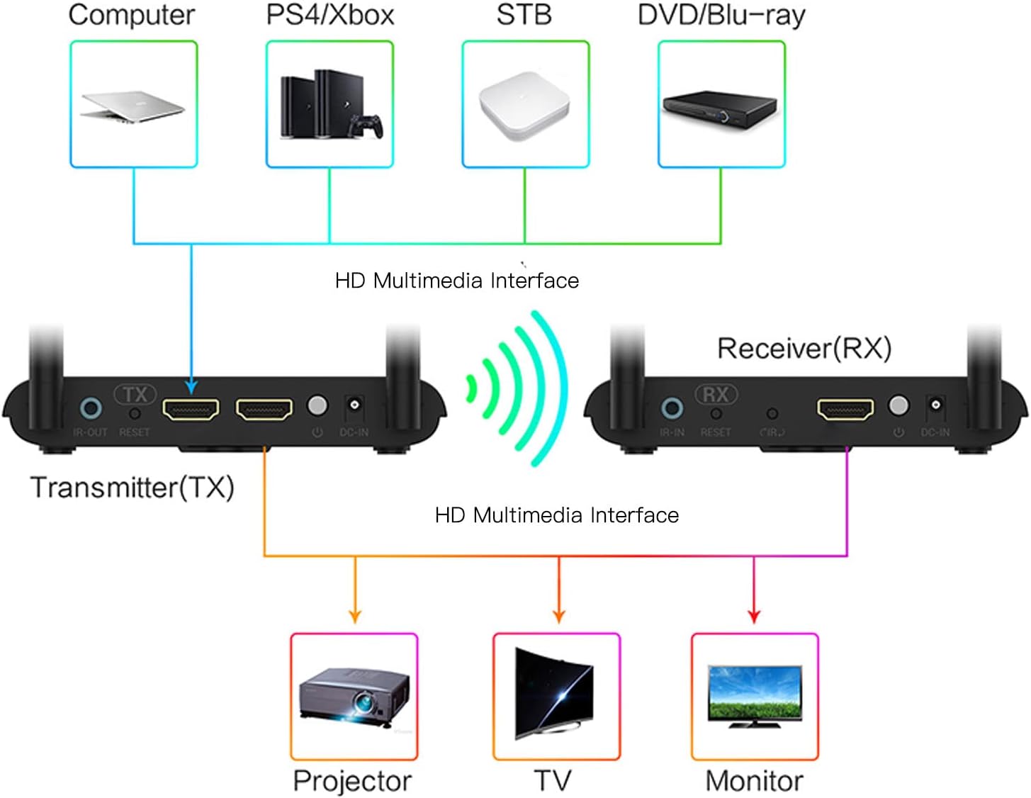 APPLICATION LARGE: L’extension vidéo HD sans fil prend en charge la boucle locale de l’interface multimédia HD et l’application étendue de télécommande infrarouge pour les réunions, la formation, l’éducation et la maison.
