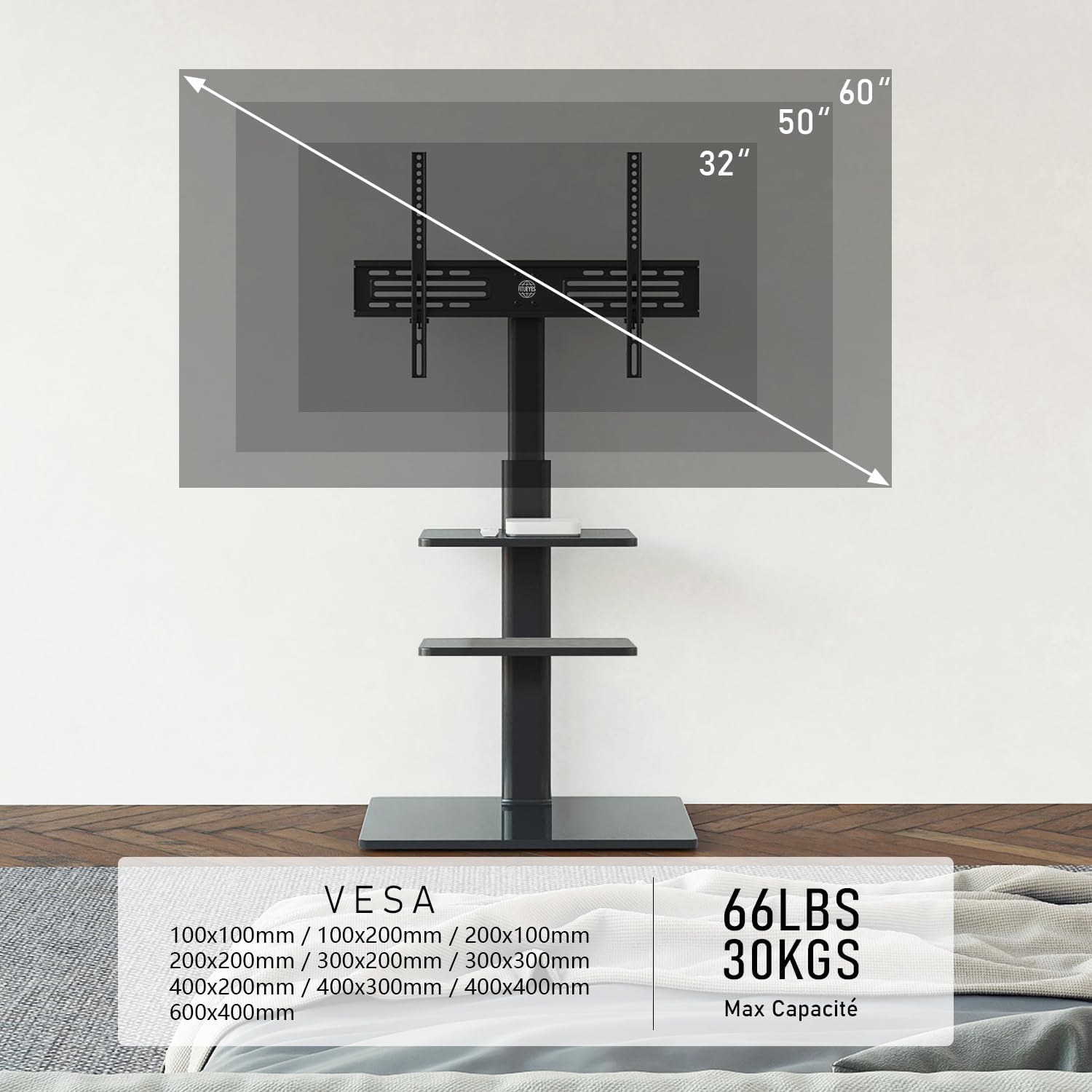 Fiche Technique FITUEYES Support Television sur Pied pour TV de 32-60 Pouces avec 3 Étagères-Support Télé sur Pied Pivotant 70° et 8 Réglages en Hauteur jusqu’à 30 KG-Max VESA 600×400 mm-Gestion des Câbles au Maroc