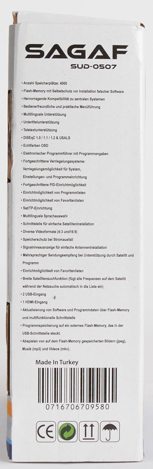 Sagaf SUD-0507 Vous pouvez régler facilement le réglage de la liste des chaînes, le réglage de la liste des favoris, le réglage Satellite/TP tout en travaillant en parfaite harmonie avec les systèmes principaux. S’il est pris en charge par le satellite ou le canal, il a la capacité de recevoir des émissions en plusieurs langues et la fonction de recherche par satellite à large bande (ajout automatique de toutes les fréquences trouvées dans la recherche de réseau). Vous pouvez mettre à jour le logiciel et les informations sur les chaînes via une clé USB à l’aide de l’interface multifonction USB, enregistrer les chaînes sur la clé USB montée sur l’interface USB.