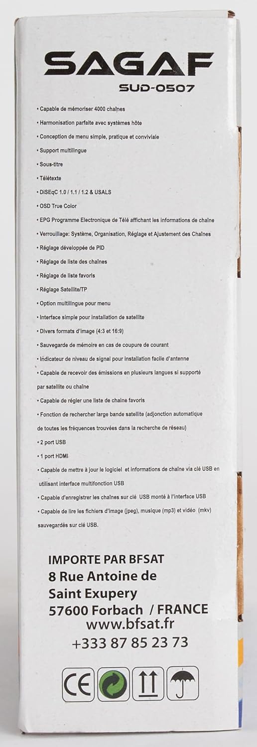 Fiche Technique Leyf & Sagaf SUD-0507 Mini Récepteur Satellite – DVB-S2 – Récepteur Satellite – Récepteur Numérique Full HD 1080p (HDTV, Scart, USB) Astra Hotbird Turksat, Uniquement pour Les chaînes allemandes au Maroc