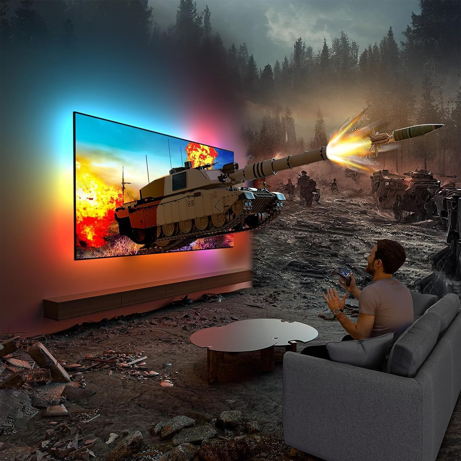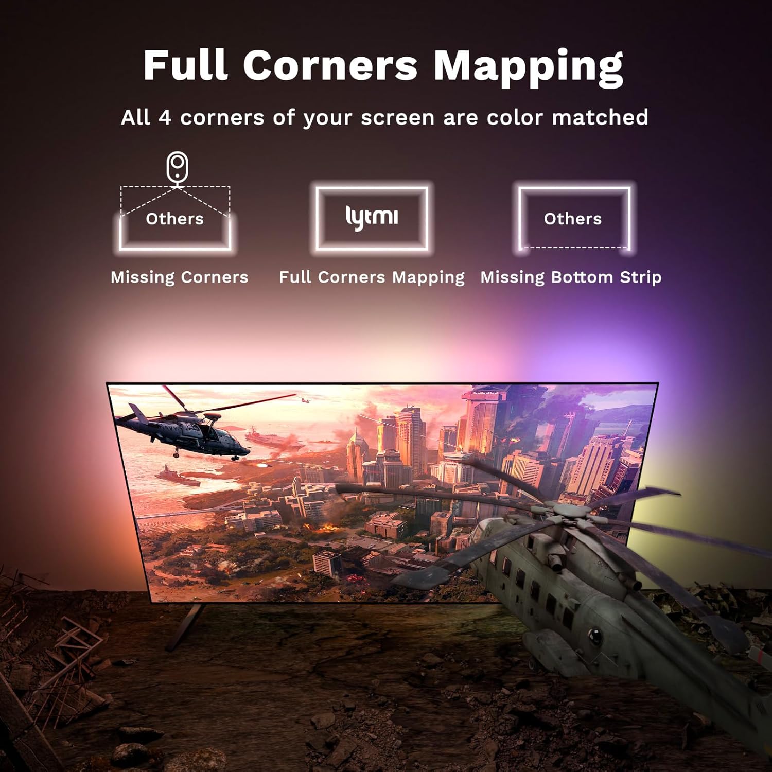 Capacité de cartographie de chaque coin : tous les coins de votre téléviseur sont de couleur assortie, de sorte que vous pouvez profiter d’une expérience visuelle parfaitement synchronisée ; particulièrement adapté pour la décoration lumineuse des jeux ou pour regarder des films.