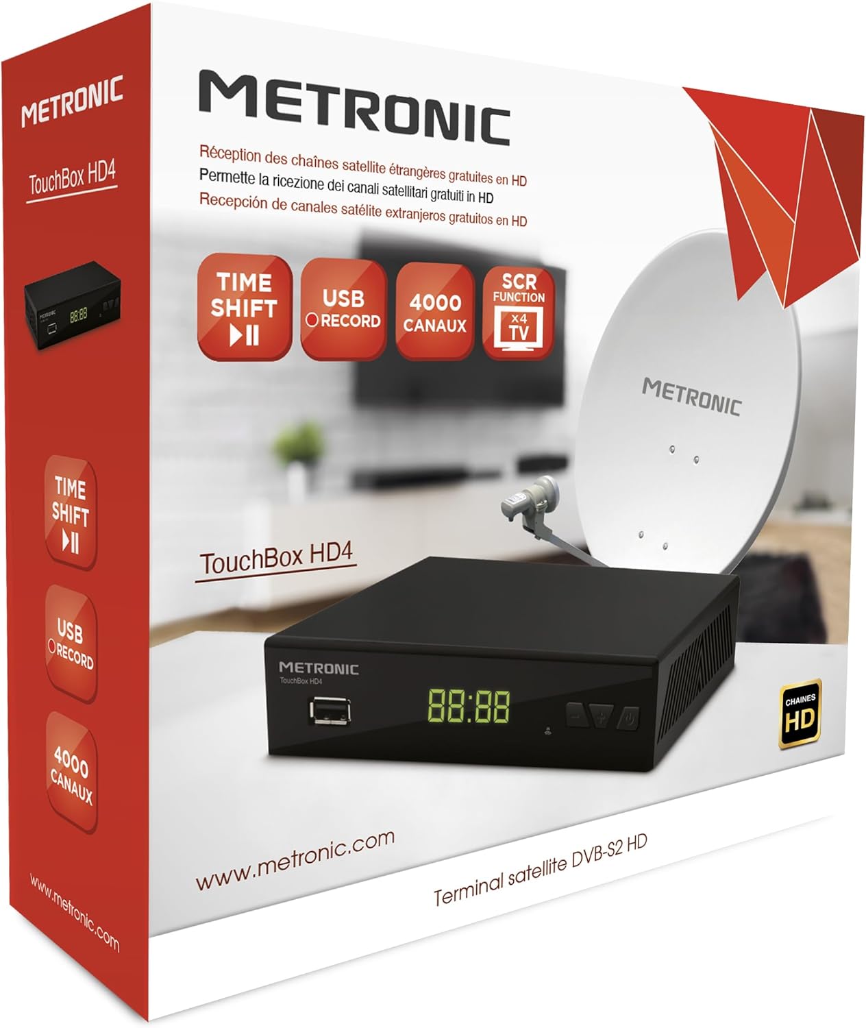 Fiche Technique Metronic 441376 Digital Digital Satellite Decoder with Touchbox HD4 / Free HD Channels and Free Foreign Channels/HDMI Demodulator, Receiver, Box, Tuner, TV Recorder au Maroc