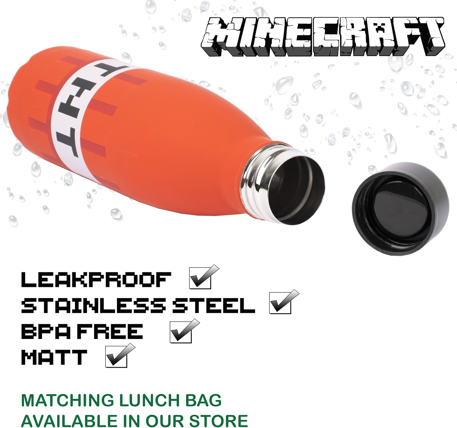 MINECRAFT Water bottle design: calls all players. This kids water bottle with a bright red TNT design is a super convenient size to carry with you, from school to activities to days with friends or family, and is a fabulous TNT design to show your love for Minecraft play. Whether it’s giving as a gift to your Minecraft loving friends or for lunch refreshment, this is an essential bottle for kids.