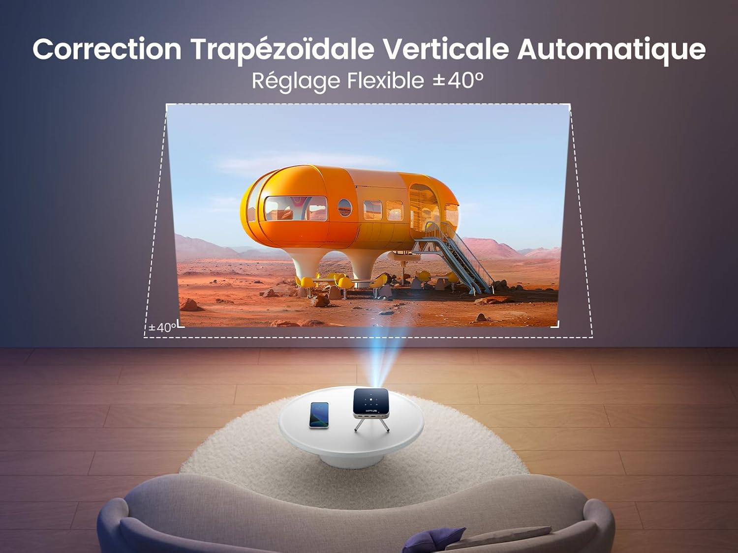 💖【Ultra Courte Focale Vidéoprojecteur Portable WiFi Bluetooth, Keystone Verticale Automatique, Rapport de Projection 1,2:1】Ce mini vidéoprojecteur ne mesure que 12 x 12 x 2.8cm et pèse environ 0.35kg, ce qui le rend facile à transporter, et grâce à son avantage de focale ultra courte, vous pouvez le projeter à volonté sur le bureau/mur ou au plafond, et profiter de films/jeux de sport/jeux vidéo avec votre famille ou vos amis à tout moment et en tout lieu. De plus, le projecteur portable 1080p est équipé d’une correction trapézoïdale verticale automatique de ±40°, ainsi vous pouvez profiter d’une image rectangulaire claire et parfaite en quelques secondes.