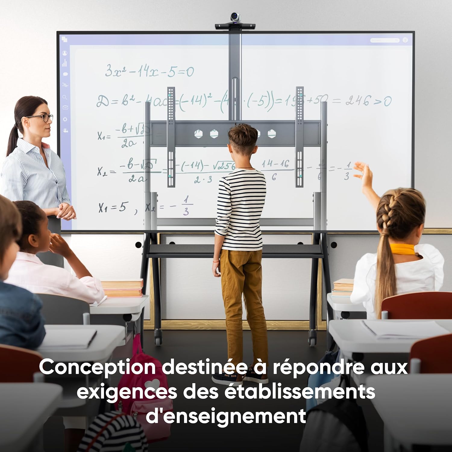 MEUBLE TV À ROULETTES | Support télé sur pied roulettes est un idéal pour tenir les présentations, formations, leçons | Grâce à la position des pieds du meuble TV roulette, il est confortable pour deux personnes de travailler avec un tableau interactif | Support TV sur pied etagere pratique pour le placement un accessoire TV : une barre de son, ordinateur portable, stylet, clicker et plus encore