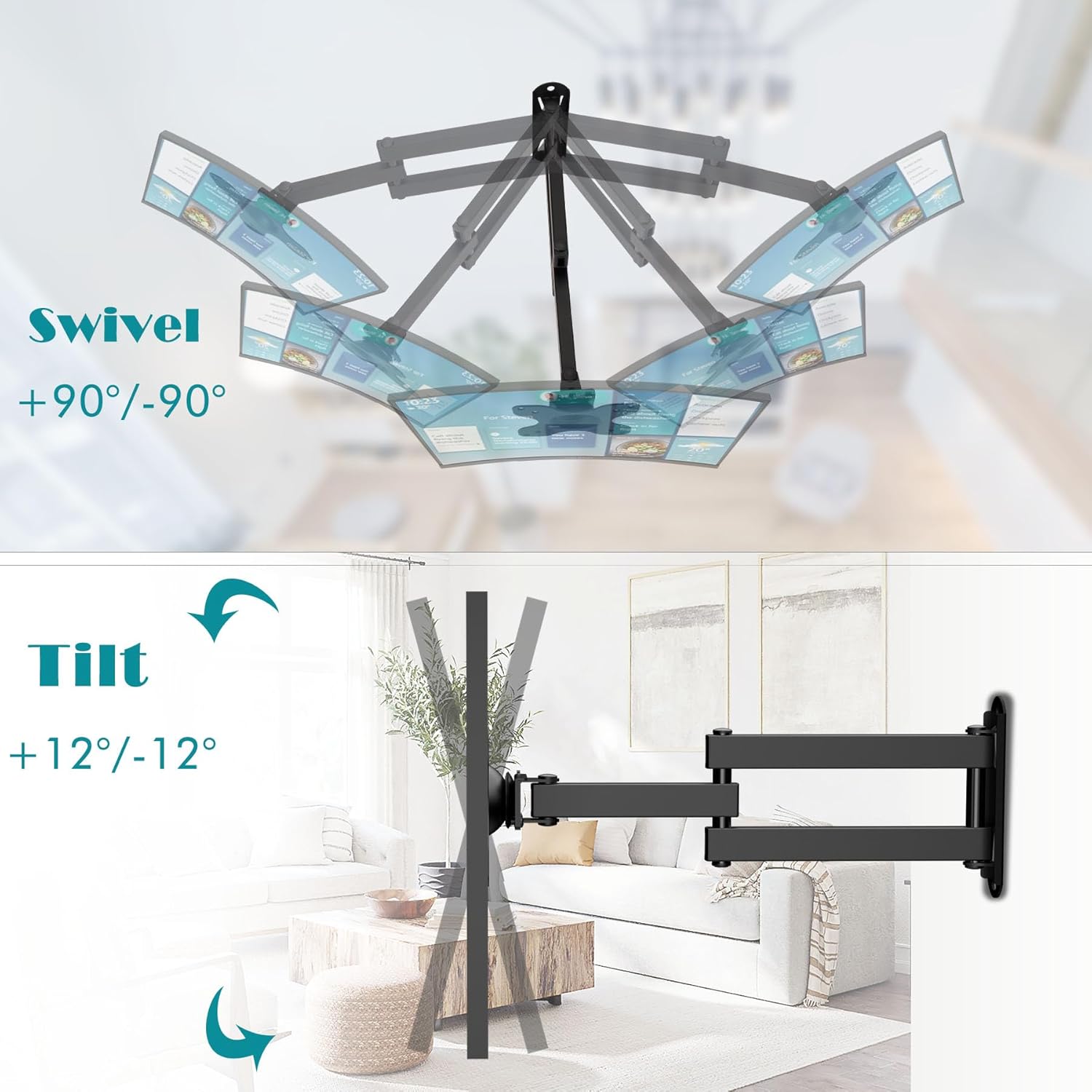 SUPPORT TV FULL MOTION : Avec ce support mural pour téléviseur, votre nouvel appareil peut pivoter d’un côté à l’autre, jusqu’à 180 degrés. Dans le même temps, le support mural pivotant pour téléviseur peut s’incliner vers le haut de 12° et vers le bas de 12°, pour obtenir le meilleur angle d’utilisation.