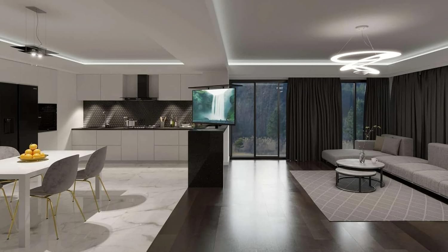 Universal VESA compatibility: Designed to fit various VESA sizes ranging from 100×100 to 600x600mm, this motorized retractable TV stand is ideal for a wide range of TVs. Its universal mounting system ensures safe and reliable mounting, maximizing space in your living room or bedroom.