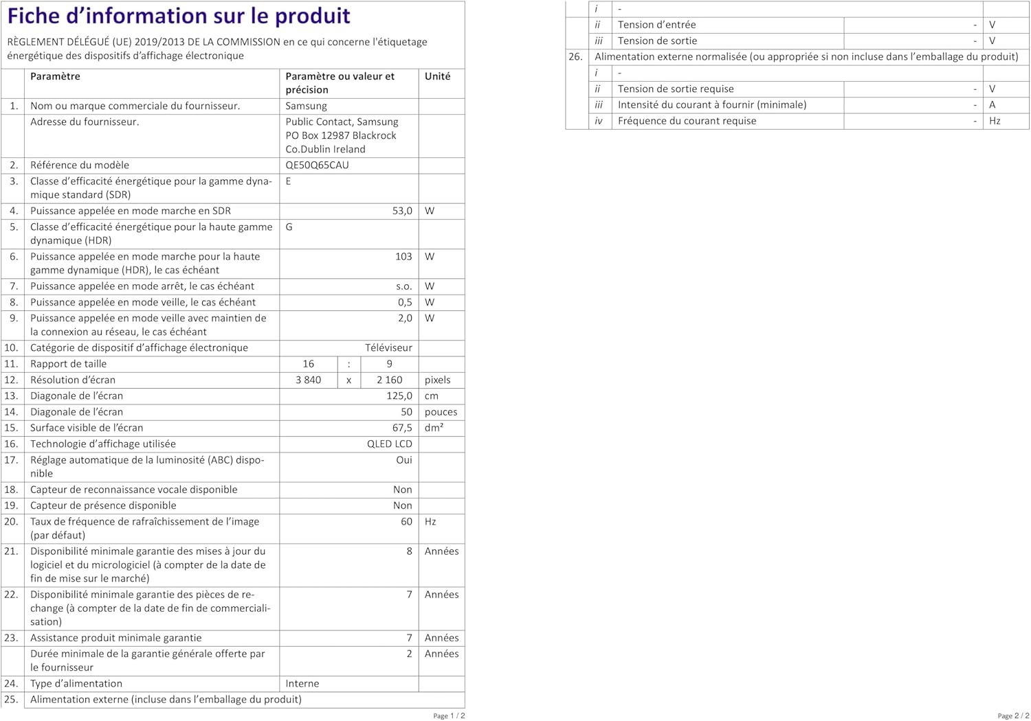 ^Contenu : 1 téléviseur Samsung Smart TV 50 pouces série Q65C, QLED 4K UHD, classe d’efficacité énergétique E, télécommande SolarCell incluse, câble d’alimentation et manuel d’instructions, dimensions avec socle (LxHxP) : 118,83 x 68,17 x 22,4 cm, Poids avec support : 11,8 kg, couleur : noir