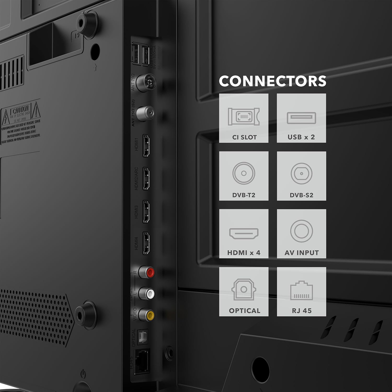 HDMI ports: 4 USB ports: 2, Dolby Audio, Wifi, Chromecast