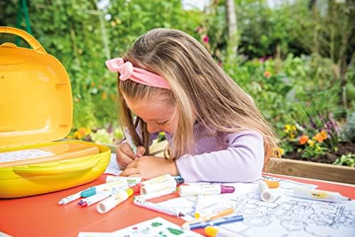 De nombreux accessoires de dessin sont inclus : 12 feutres, 12 crayons de cire, 12 crayons de couleur, 1 bloc de feuilles de jardin pré-dessinées, et des autocollants fleurs/plantes/légumes/fruits pour décorer les feuilles.
