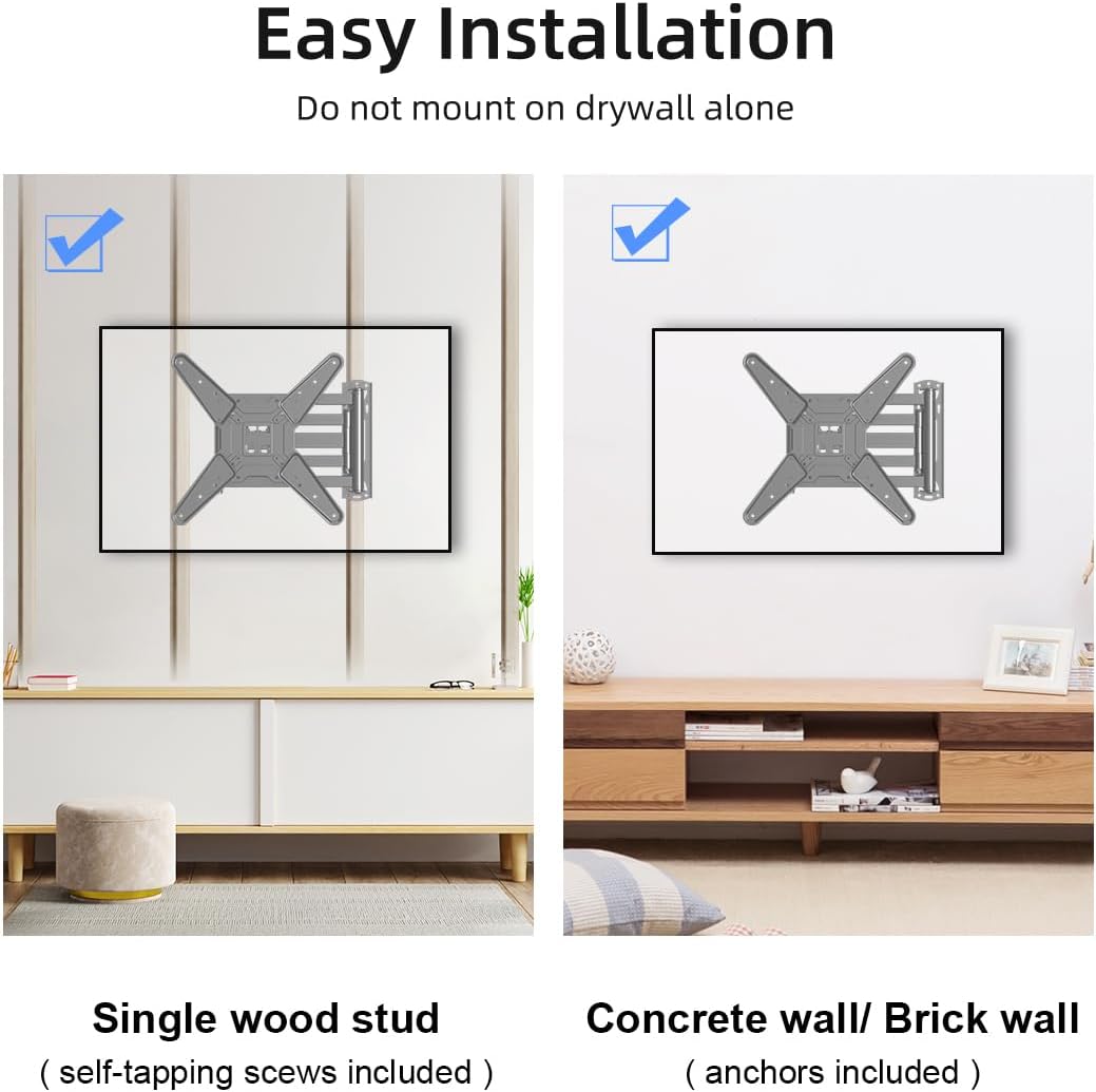 Installation facile et rapide : l’installation du support TV à bras long est un jeu d’enfant. Inclus dans la livraison : un guide d’installation clair étape par étape, un niveau à bulle et tous les kits de montage standard nécessaires. Veuillez noter que ce support ne doit pas être installé seul dans les cloisons sèches pour une adhérence et une stabilité optimales.