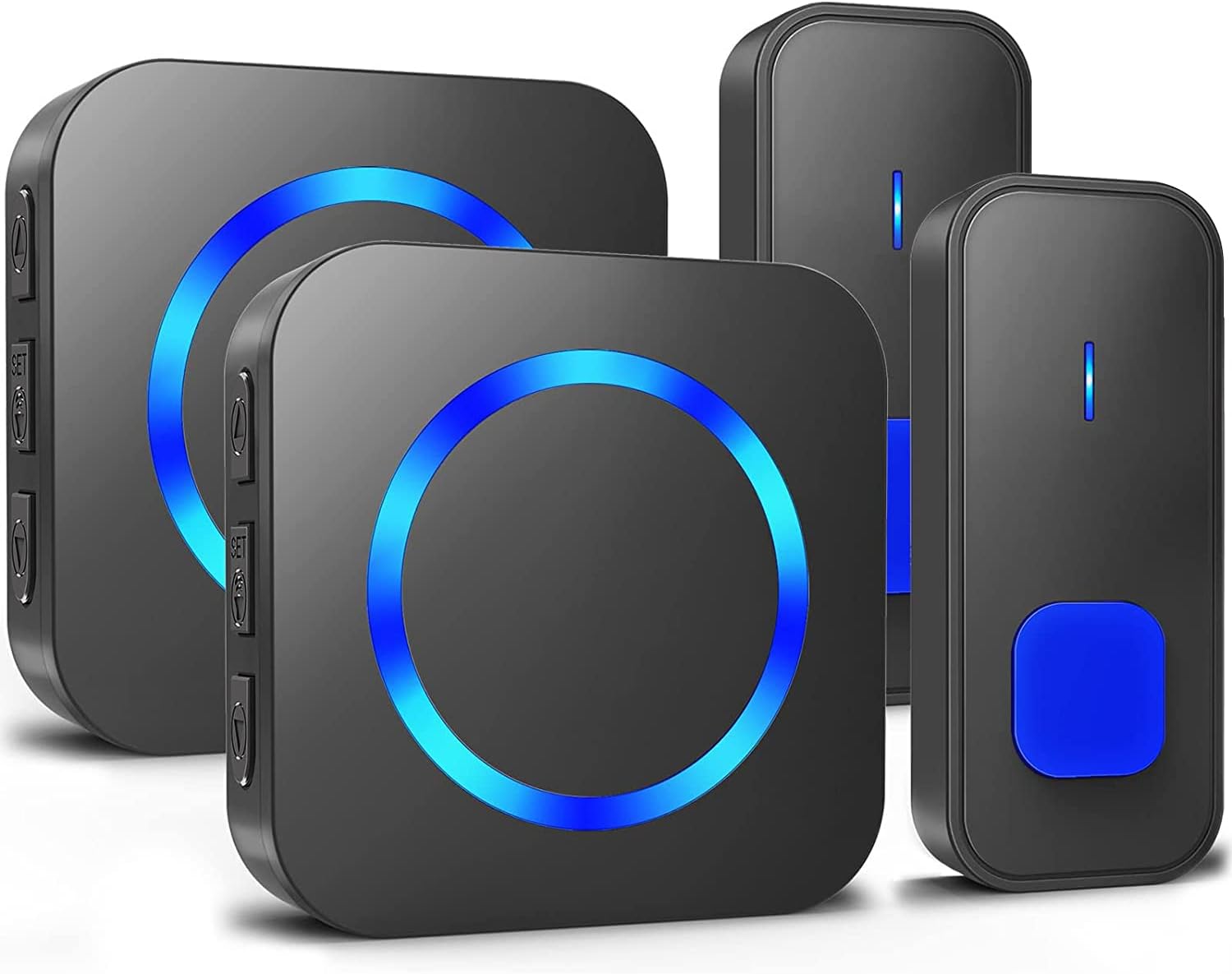 Avis sur SURFOU Sonnette sans Fil, 400M de Porte Étanche Electronique Kit de Carillon avec 2 Bouton Emetteur 2 Récepteurs Enfichables, 55 Mélodies au 5 Niveaux Volumes, LED Bleu, Noir