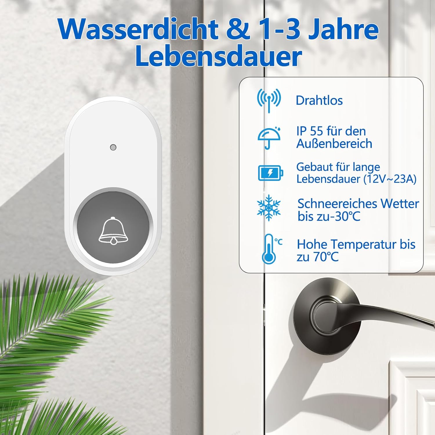 【Performance Tout Temps】Notre sonnette radio est résistante à la poussière et à l’eau, supportant des températures de -30°C à 70°C. Elle résiste à des conditions difficiles tout en bénéficiant d’une consommation d’énergie extrêmement faible pour une autonomie de batterie durable de 1 à 3 ans.