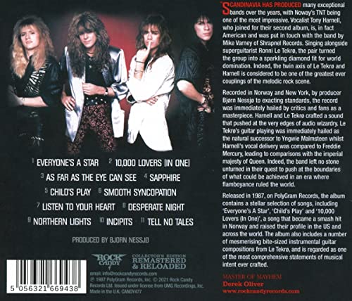 Édition remastérisée numériquement. Comprend un livret en couleur de 16 pages avec un essai de 3 500 mots, des illustrations améliorées avec des photos inédites et de nouvelles interviews. La Scandinavie a produit de nombreux groupes exceptionnels au fil des ans, le TNT de Noway étant l’un des plus impressionnants. Le chanteur Tony Harnell, qui les a rejoints pour leur deuxième album, est en fait américain et a été mis en contact avec le groupe par Mike Varney de Shrapnel Records. Chantant aux côtés du super guitariste Ronni Le Tekrø, le duo a transformé le groupe en un diamant étincelant apte à dominer le monde. En effet, le double axe de Le Tekrø et Harnell est considéré comme l’un des plus grands couplages de la scène rock mélodique. Enregistré en Norvège et à New York, par le producteur Bjørn Nessjø selon des normes rigoureuses, le disque a été immédiatement salué par la critique et les fans comme un chef-d’œuvre. Harnell et Le Tekrø ont créé un son qui a poussé aux confins de la magie audio. Le jeu de guitare de Le Tekrø a été immédiatement salué comme le successeur naturel d’Yngwie Malmsteen tandis que la prestation vocale de Harnell a été comparée à Freddie Mercury, ce qui a conduit à des comparaisons avec la majesté impériale de Queen. En effet, le groupe n’a ménagé aucun effort dans sa quête pour repousser les limites de ce qui pouvait être réalisé à une époque où la flamboyance régnait sur le monde. Sorti en 1987, sur PolyGram Records, l’album contient une sélection stellaire de chansons, dont ‘Everyone’s A Star’, ‘Child’s Play’ et ‘10,000 Lovers (In One)’, une chanson qui est devenue un hit en Norvège et a soulevé leur profil aux États-Unis et dans le monde entier. L’album comprend également un certain nombre de compositions de guitare instrumentales fascinantes de la taille d’une bouchée de Le Tekrø, et est considéré comme l’une des déclarations d’intention musicale les plus complètes jamais conçues.