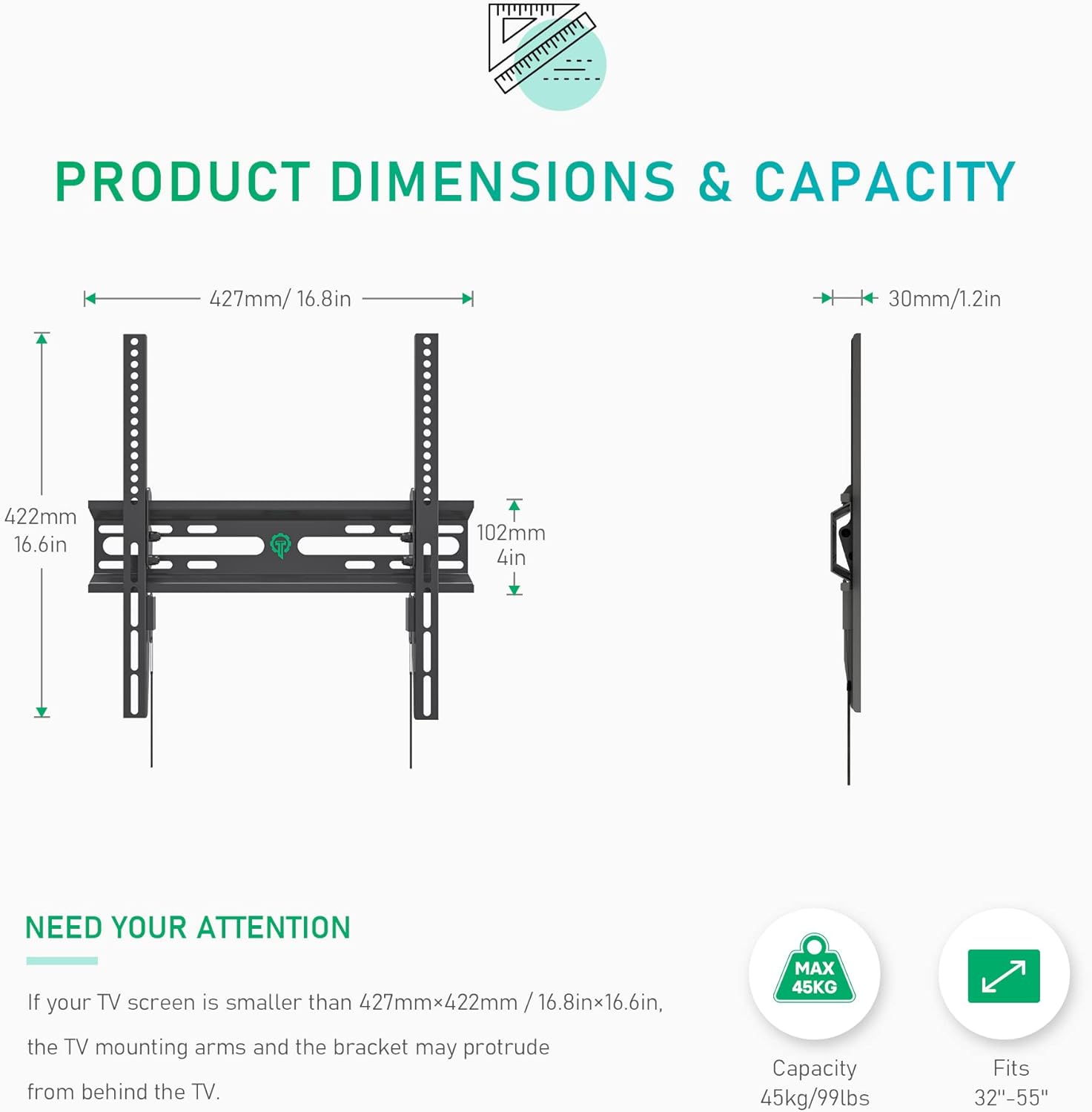 Dimensions and capacity: Product dimensions – 427 mm x 422 mm x 30 mm, suitable for 32″ to 55″ TVs. Slim, streamlined design saves space and modern aesthetics.