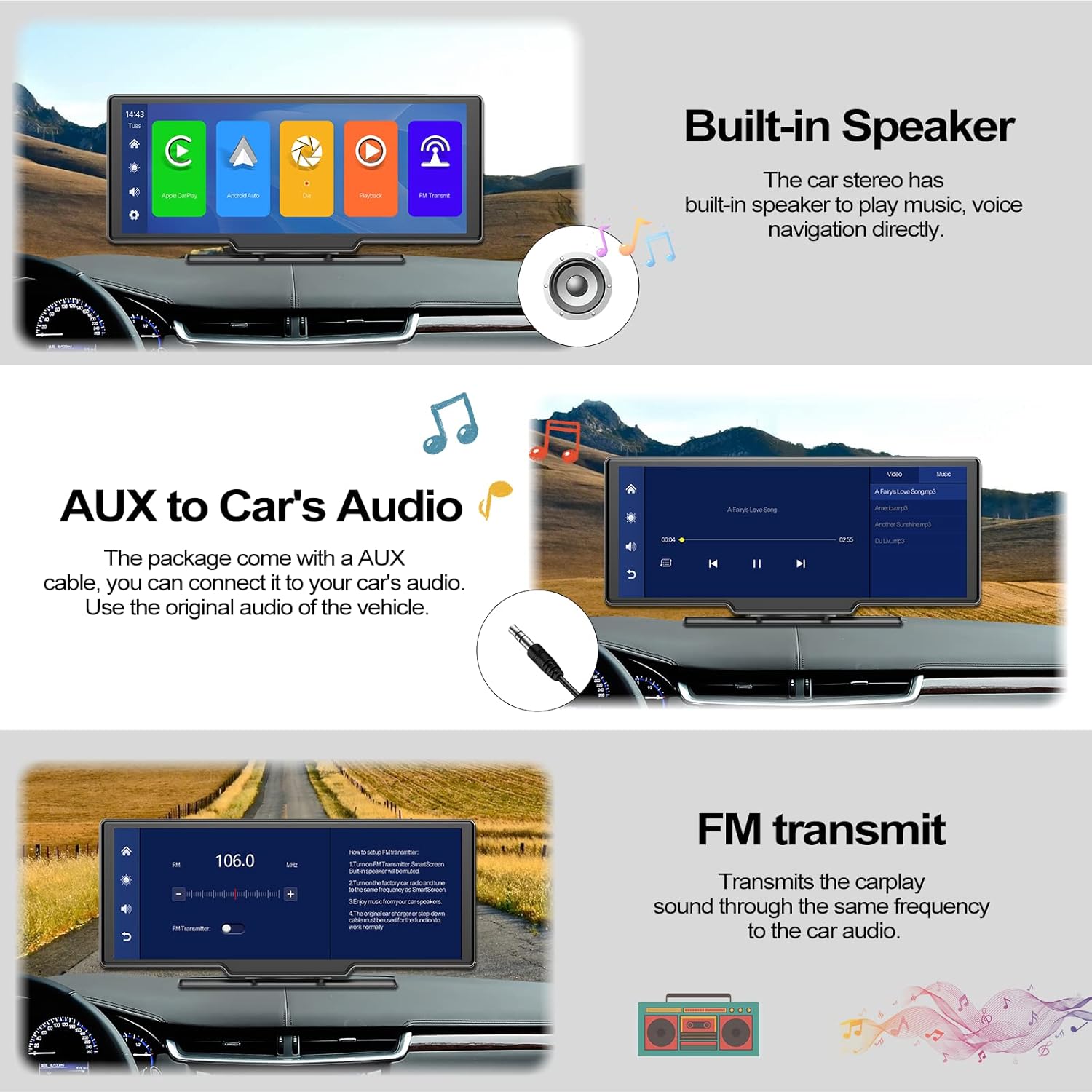 Avis sur 【2024 Upgrade】 CAMECHO 10,26“ Écran Carplay sans Fil Android Auto avec 32GB TF Card, Portable ecran Carplay Voiture Touchscreen avec Bluetooth, AUX-in, transmetteur FM pour 7-32V Tous Les véhicules