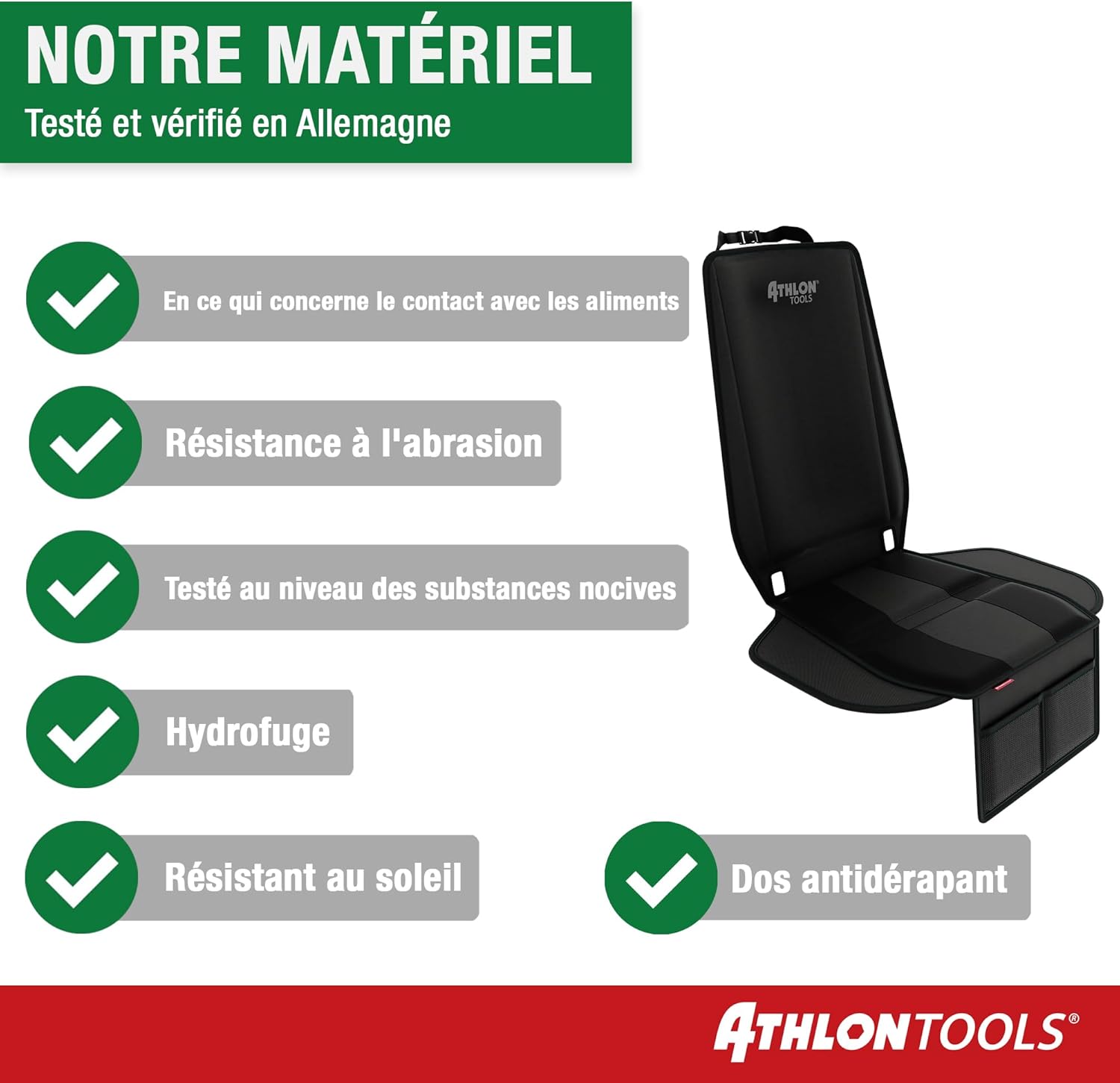 Fiche Technique ATHLON TOOLS Tapis de siège Auto avec Protection latérale – Ajustement Optimal – Compatible Isofix – Rembourrage épais – pour sièges Enfants, Coques bébé et rehausseurs au Maroc