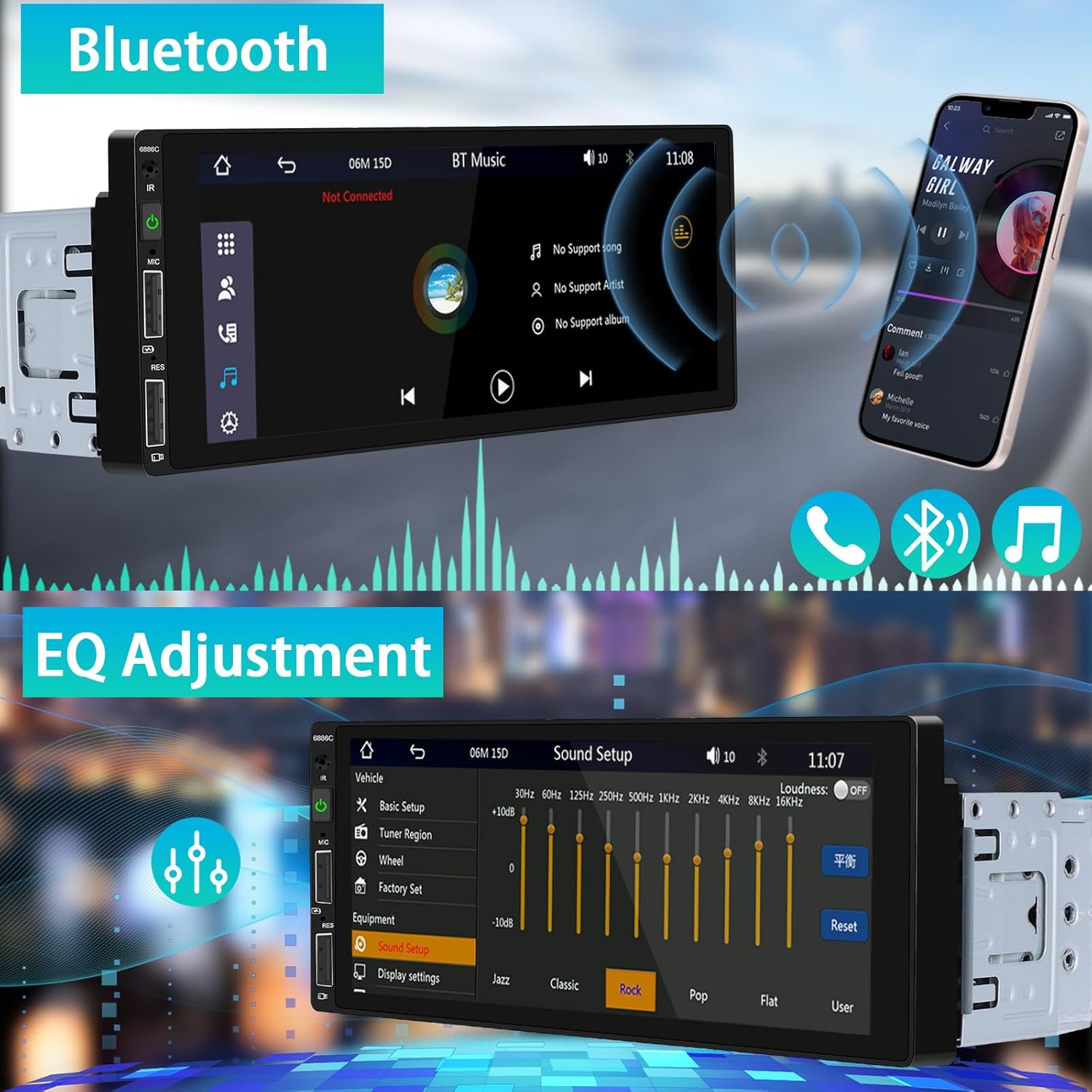 【Autoradio Bluetooth, Radio FM et égaliseur de Son】Système bluetooth intégré et microphone intégré, profitez de la musique Bluetooth et des appels mains libres, téléchargez automatiquement le répertoire téléphonique. Radio FM avec stéréo de haute qualité, qui peut rechercher des chaînes de manière entièrement automatique, semi-automatique et de réglage précis. Effet sonore de l’égaliseur 10 segments de contrôle de l’effet sonore plus vigoureux