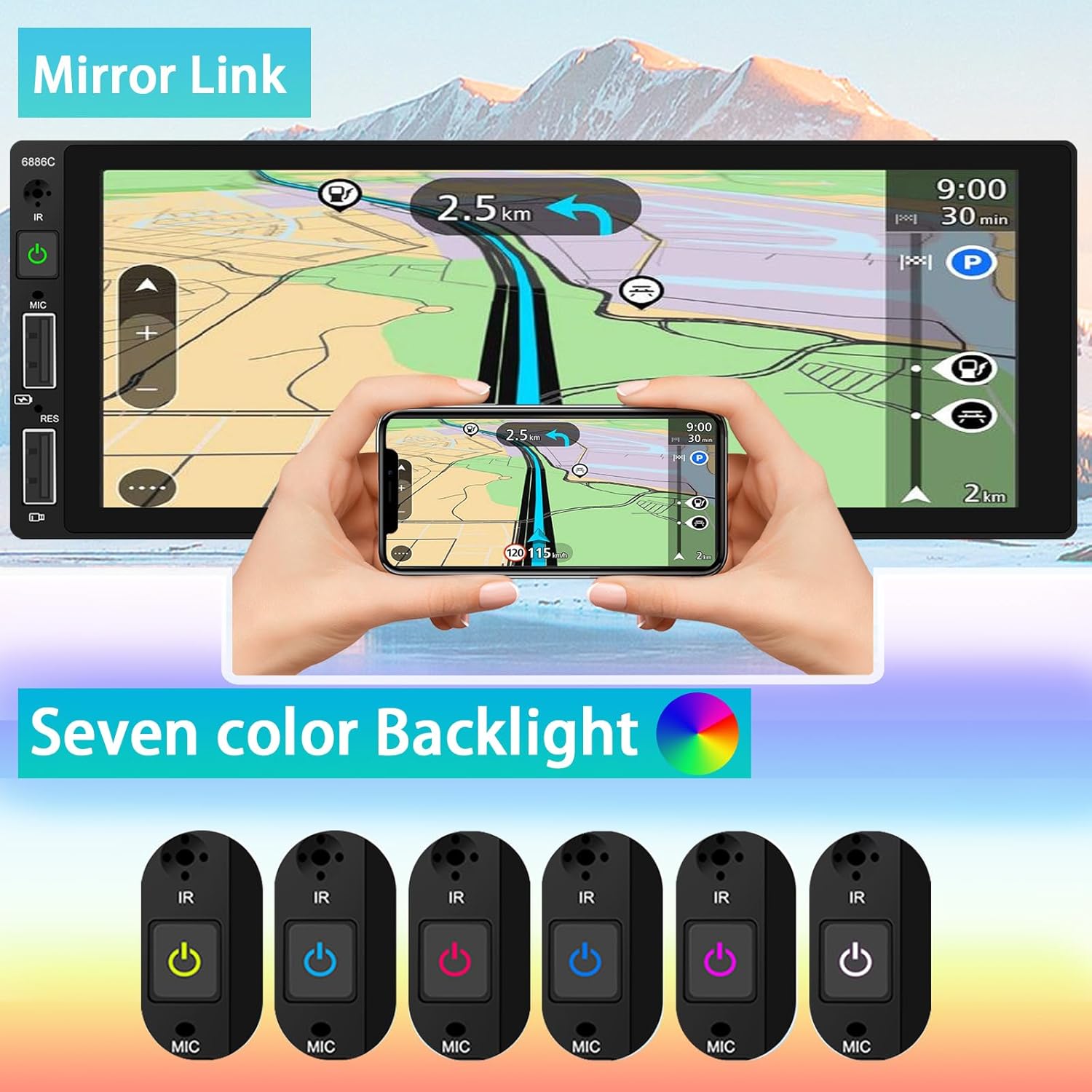【Autoradio Universel 1 DIN】Dimensions d’installation : 187*80*52 mm. Écran tactile haute définition de 6,86 pouces, interface de menu dynamique. Avec 7 couleurs de rétroéclairage, vous pouvez configurer la présentation du rétroéclairage. Sur le côté de l’écran LCD se trouve la fente USB pour lire de la musique et des vidéos, la fonction d’entrée audio AUX, vous pouvez également charger votre téléphone via USB