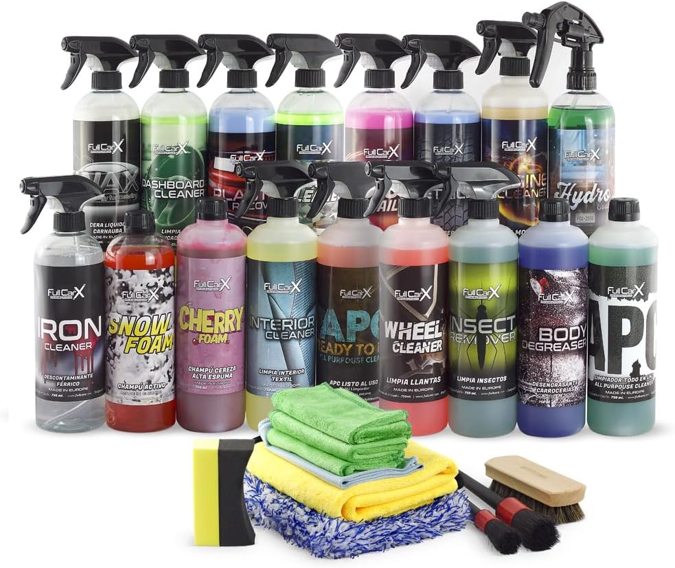 Fiche Technique FULLCARX Super Kit Detailing Nettoyage Voiture Extérieur Intérieur avec Accessoires, 17 Produits Professionnels Nettoyant Jantes Shampoing Cire Plastique Tableau Bord Insectes Moteur APC, Pack Complet au Maroc