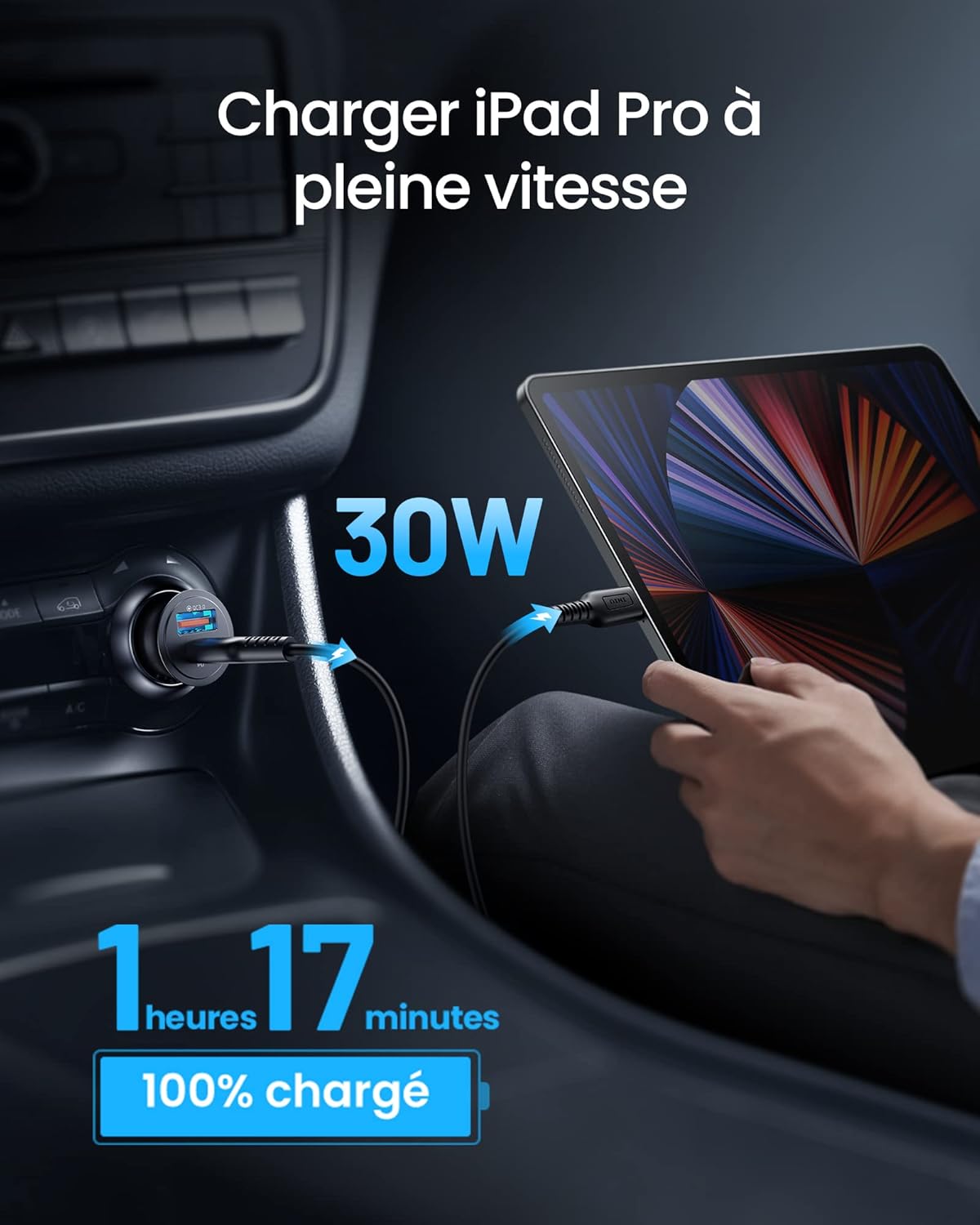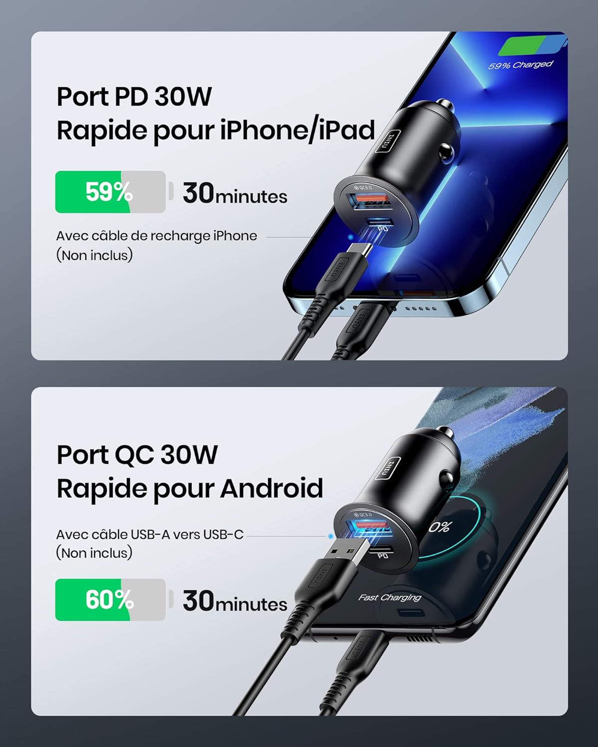 Contrairement à la plupart des chargeurs de voiture avec 2 mêmes ports USB, il dispose de ports USB C de 30 W max et de ports USB de 30 W max pour s’adapter à tous les appareils