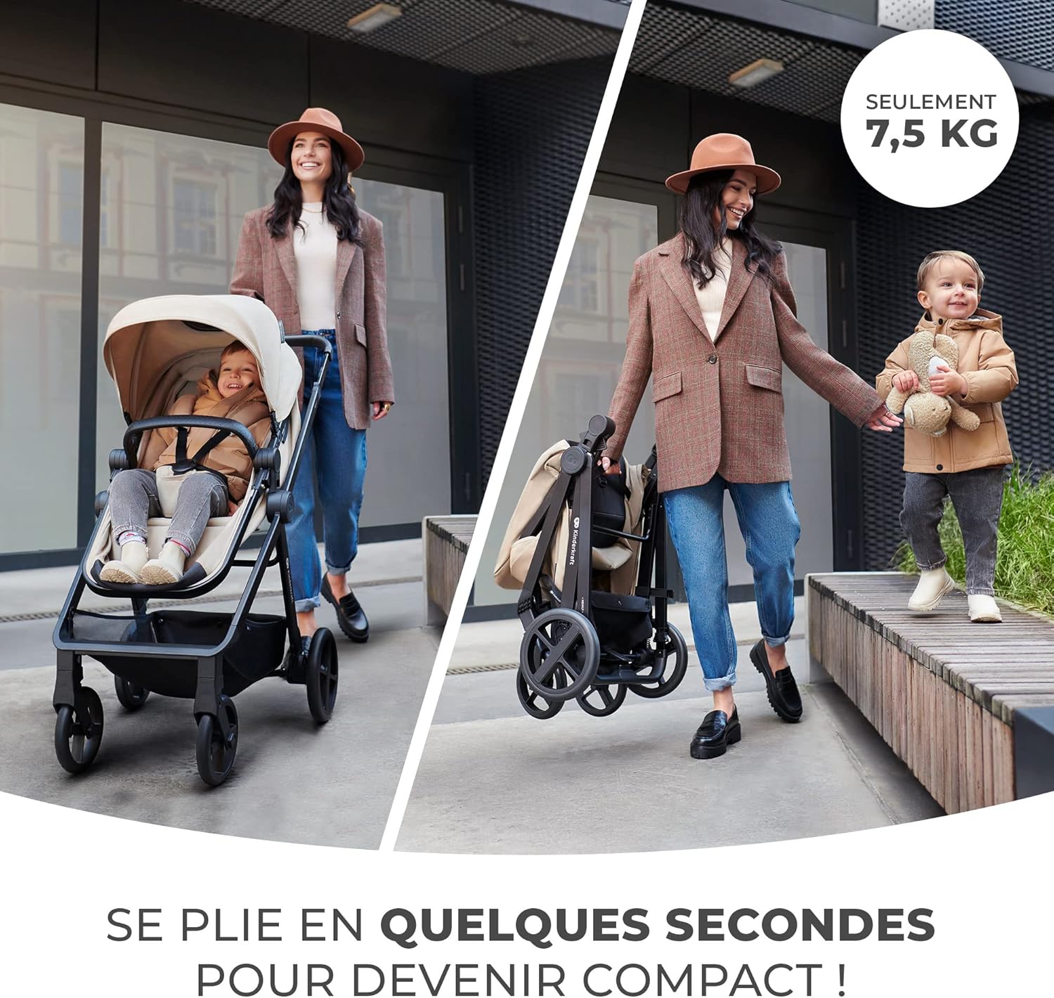 ✅ PRATIQUE : elle se plie avec le siège replié. La poussette peut être installée face ou dos à la route. Elle est légère (7,5 kg), ce qui permet de la transporter facilement dans les escaliers. Le siège MINK PRO i-Size (40-75 cm) et les adaptateurs* inclus vous permettent de créer un SYSTÈME DE VOYAGE.