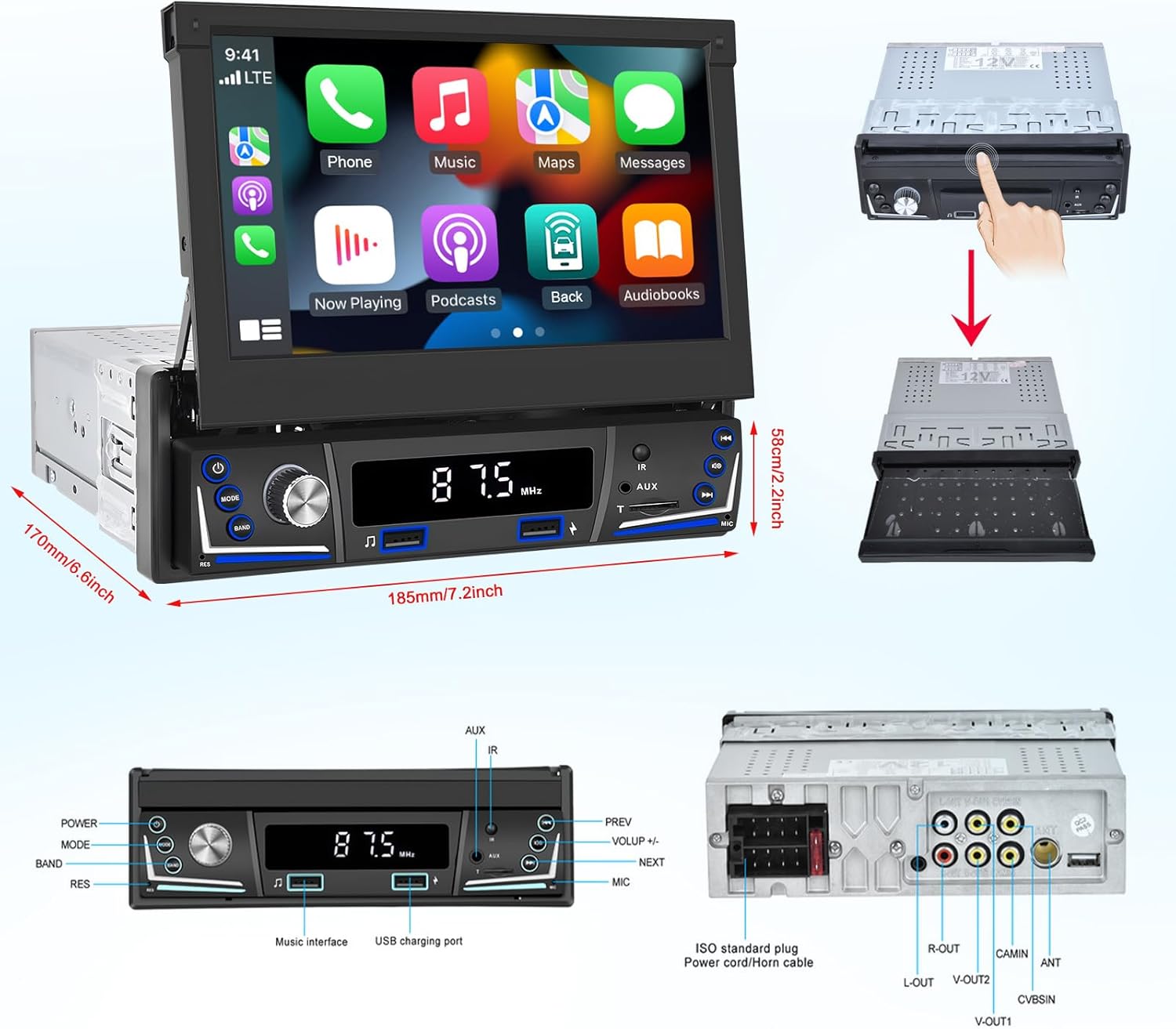 Apple Carplay et Android Auto sans fil/filaire : les utilisateurs de Carplay peuvent se connecter au système du véhicule via un câble de données pour mettre en œuvre la navigation vocale, passer des appels, envoyer et recevoir des messages et écouter de la musique.Écran télescopique réglable manuellement : écran télescopique + écran de jeu vertical HD à angle réglable.Structure : écran tactile + radio 1Din, l’écran peut être rétracté manuellement et pivoté de 30° d’avant en arrière.Caméra arrière : prend en charge l’entrée d’image de la caméra HD 720p.Prise en charge du microphone externe (non inclus) : réglez le microphone externe pour que l’autoradio puisse mieux recevoir le son.Radio AM/FM : musique en ligne, vous pouvez diffuser de la musique sur votre autoradio via FM et profiter de l’autoradio d’origine avec 18 stations préréglées.Connexion de téléphone portable : prend en charge la connexion de téléphone portable et le contrôle mutuel, jusqu’à la version IOS 13.4, la version Android 10.1.Éclairage des touches : 7 couleurs d’éclairage des touches rétroéclairées.Fonction de charge rapide : prend en charge la charge rapide USB du téléphone portable.Fonction Bluetooth 5.1 : version Bluetooth 5.1 double passe/prise en charge des appels entrants et sortants/répertoire téléphonique synchrone/lecture de musique sur téléphone portable/fonction vocale.Multimédia : prend en charge différentes marques de disque U/carte T/lecteur de carte USB/entrée audio et vidéo (AUX IN)/sortie audio (caisson de basses)/sortie vidéo (même écran).