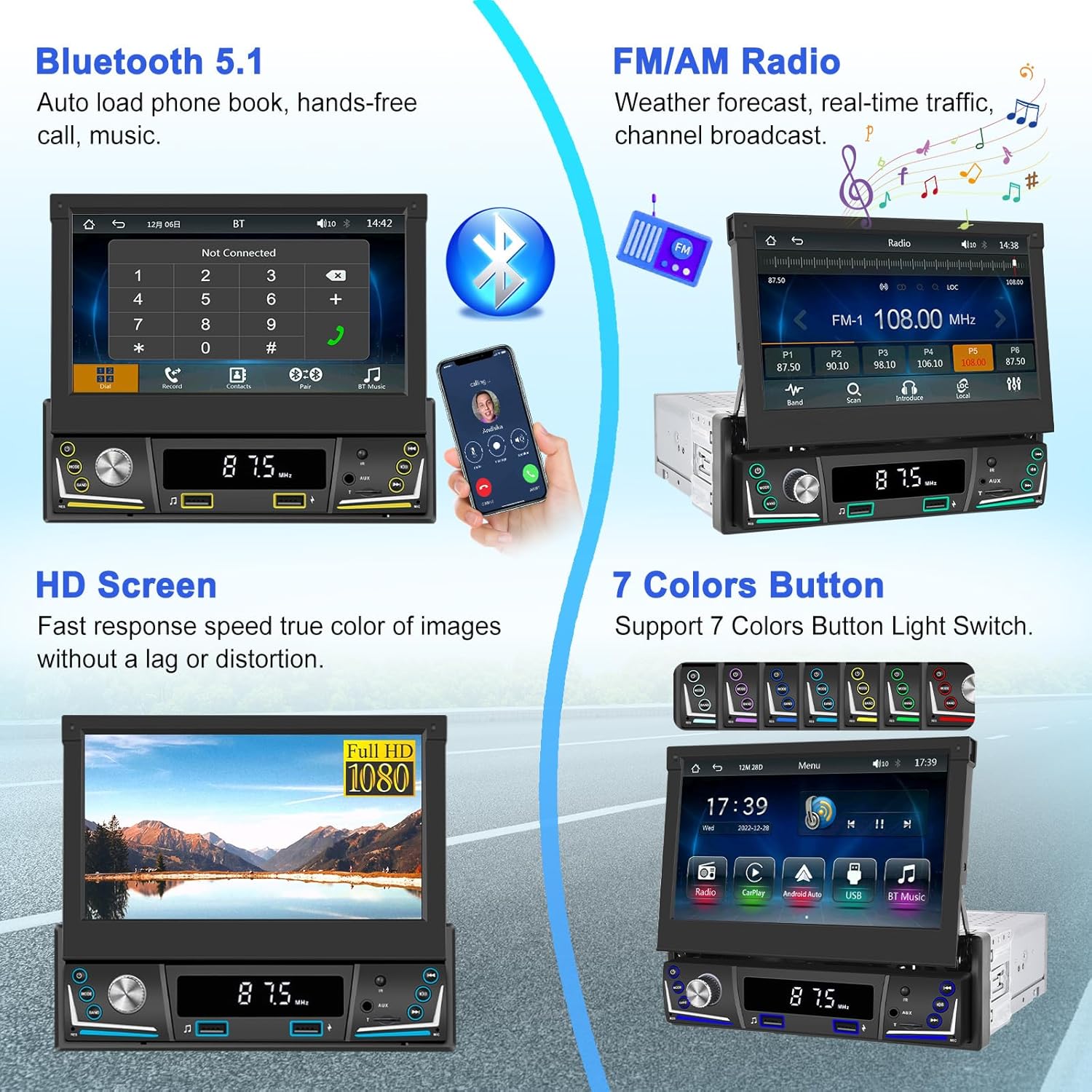 【Bluetooth 5.1 et Radio AM FM】 – Le microphone intégré prend en charge les appels mains libres Bluetooth A2DP, la lecture de musique Bluetooth et le téléchargement automatique du répertoire. Chaînes FM avec 18 stations de radio préréglées, écoutez les prévisions météo, les conditions routières en temps réel, les actualités, etc.